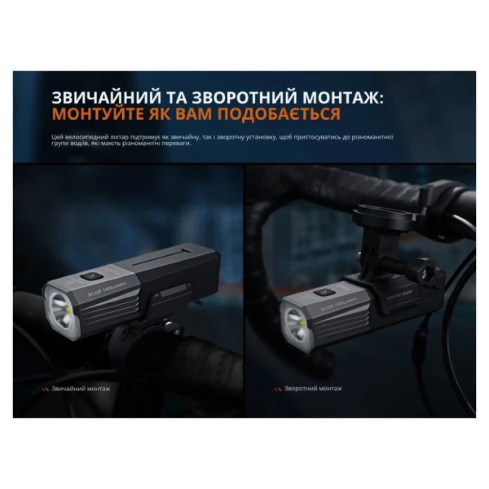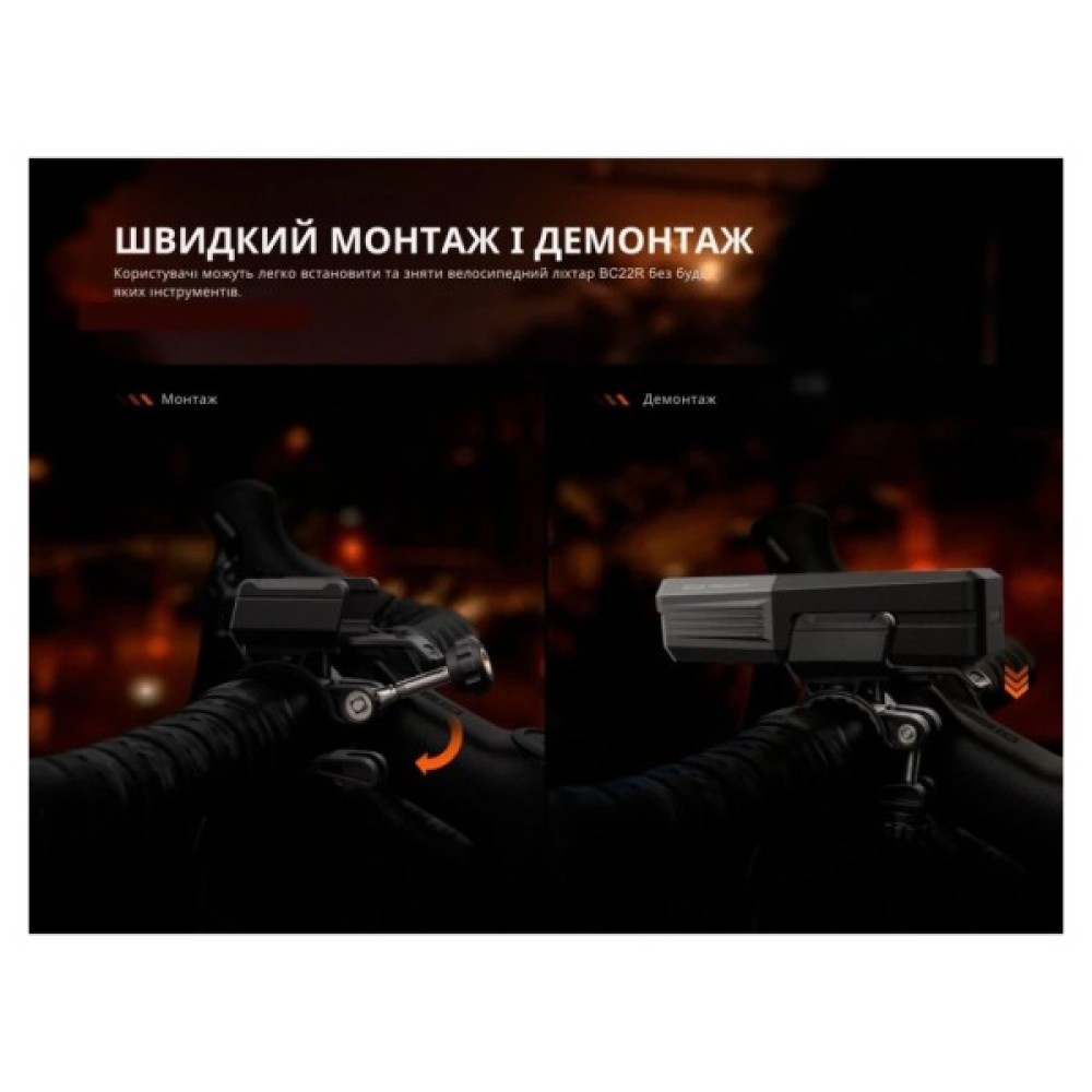 Велофара Fenix BC22R, Li-ion акумулятор ARB-L18-3400, зарядний кабель USB-C, велосипедне кріплення з адаптером, запасне ущільнювальне кільце, інструкція користувача, гарантійний талон.