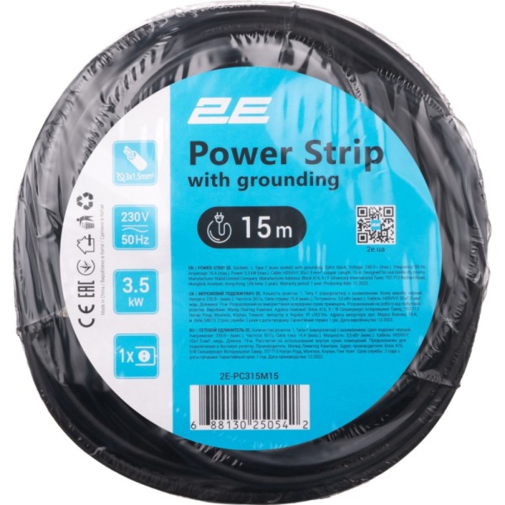 Мережевий подовжувач 2Е (2E-PC315M15) на 1 розетку Типу F (євророзетка із заземленням), вилка Типу F (євровилка із заземленням), H05VV-F 3G*1.5мм2, 15 метрів, колір чорний. Мережевий подовжувач 2Е призначений для під'єднання широкого спектра комп'ютерної, побутової та електронної техніки до електричної мережі. Кабель завдовжки 15 м дає змогу підключати техніку у віддалених в місцях від стаціонарних розеток. Подовжувач оснащений вилкою та розеткою євростандарту. Мережевий подовжувач 2Е - чудовий помічник у квартирі, в офісі та на дачі.