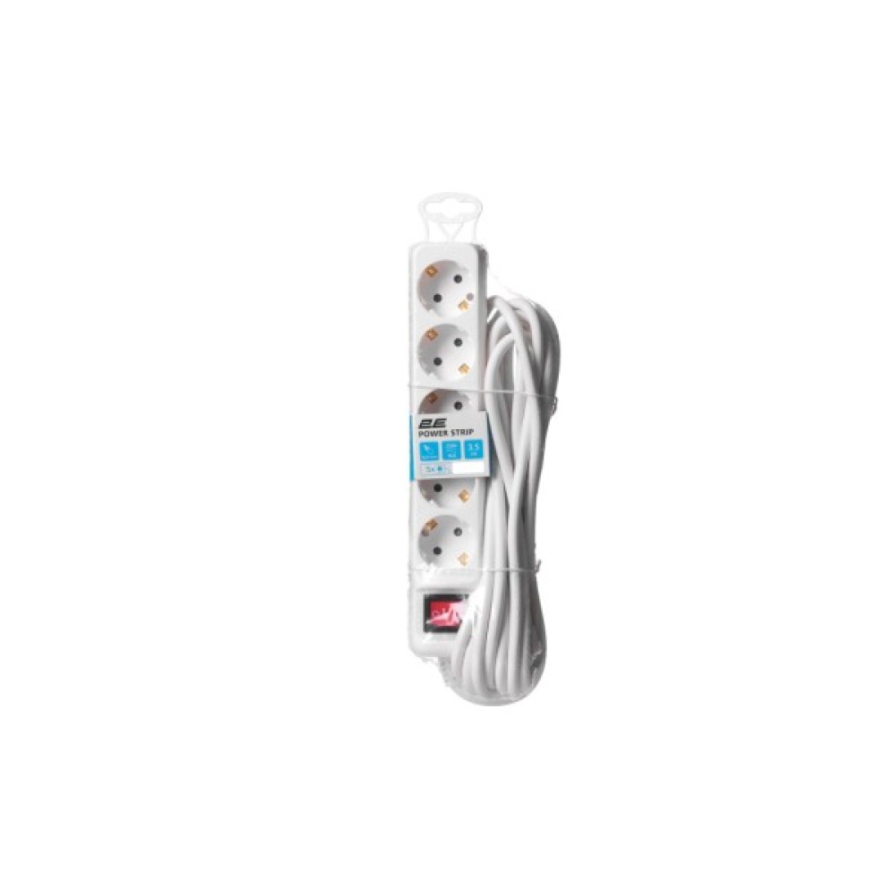 Подовжувач мережі 2E з вимикачем на 5 розеток Типу F (євророзетка із заземленням), вилка Типу F (із заземленням). Кабель H05VV-F 3Gх1.5 мм, довжина кабелю – 5 м, колір білий.