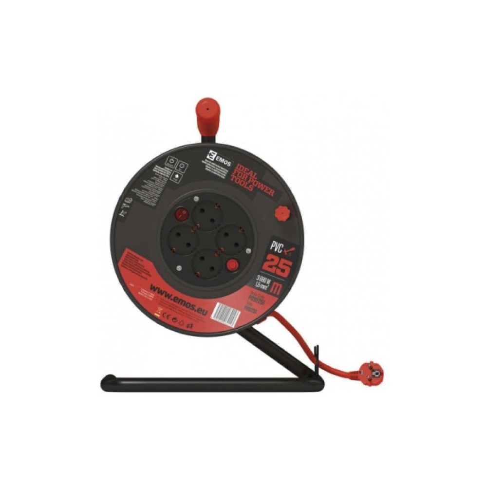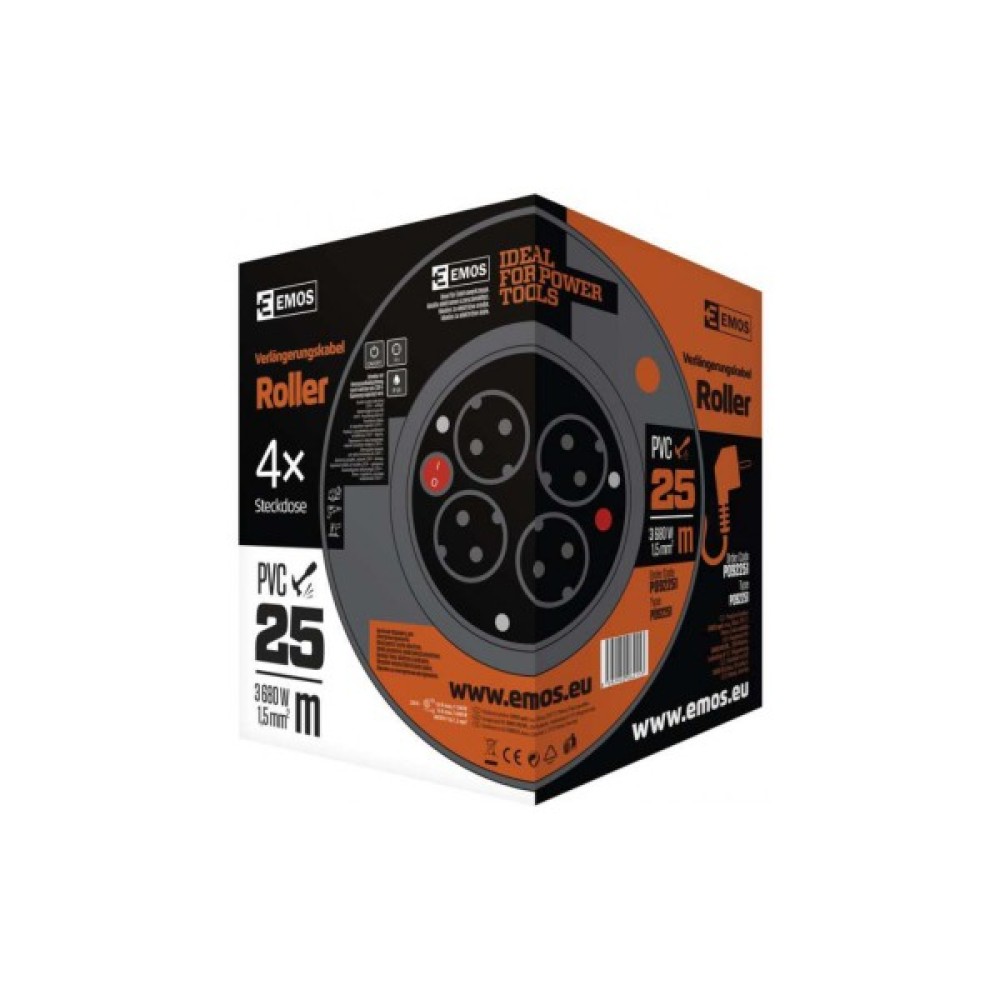 Подовжувач на котушці P092251 від чеського виробника Emos. Має перетин кабелю 1,5 мм що обумовлює підвищену стійкість до навантажень від використання приладів з великим енергоспоживанням.