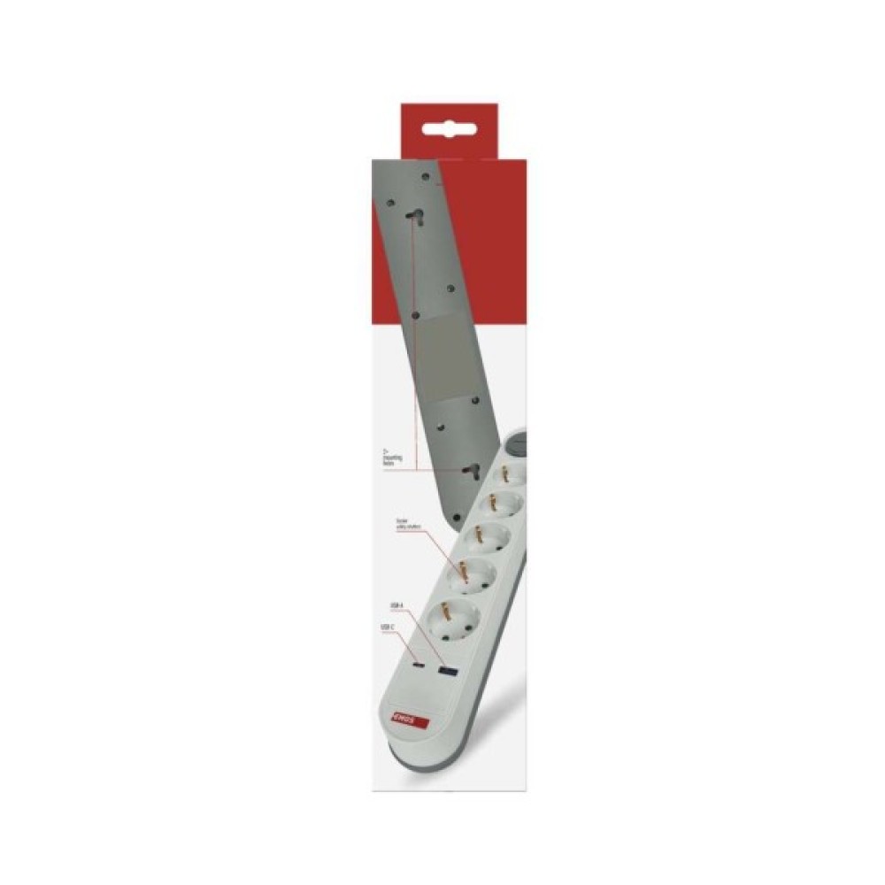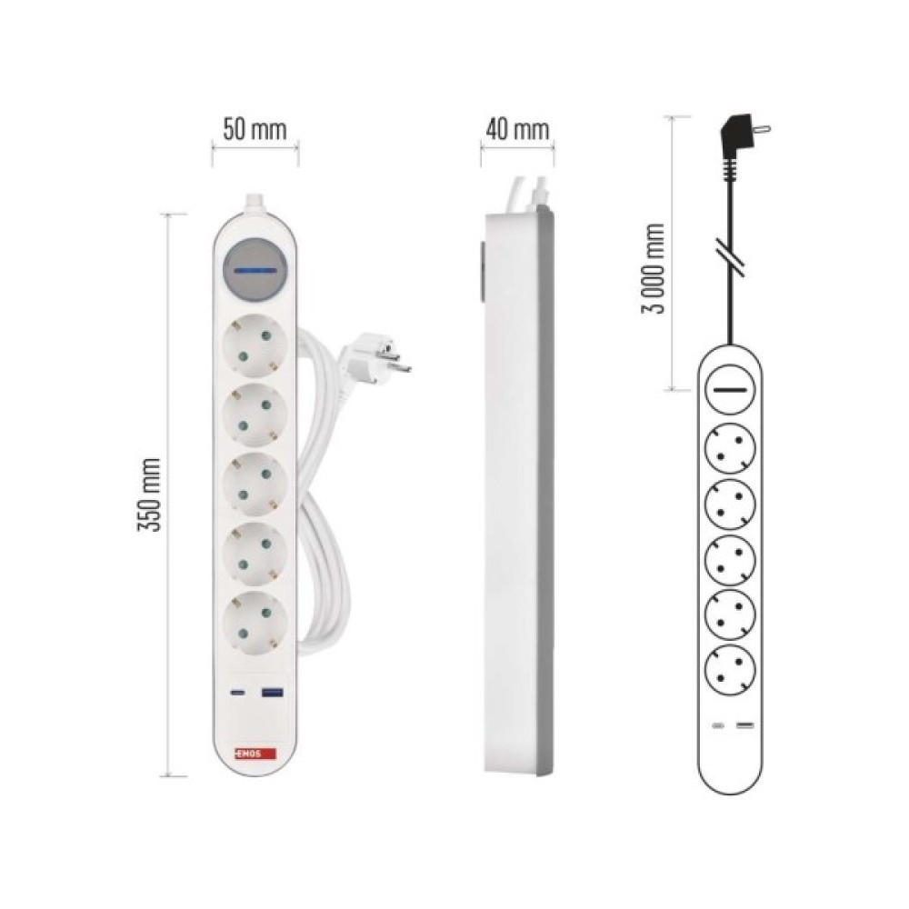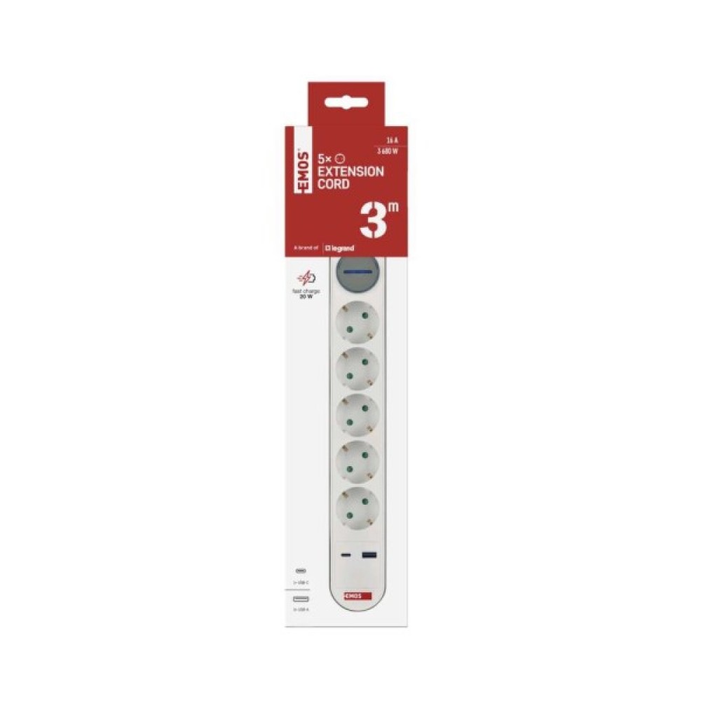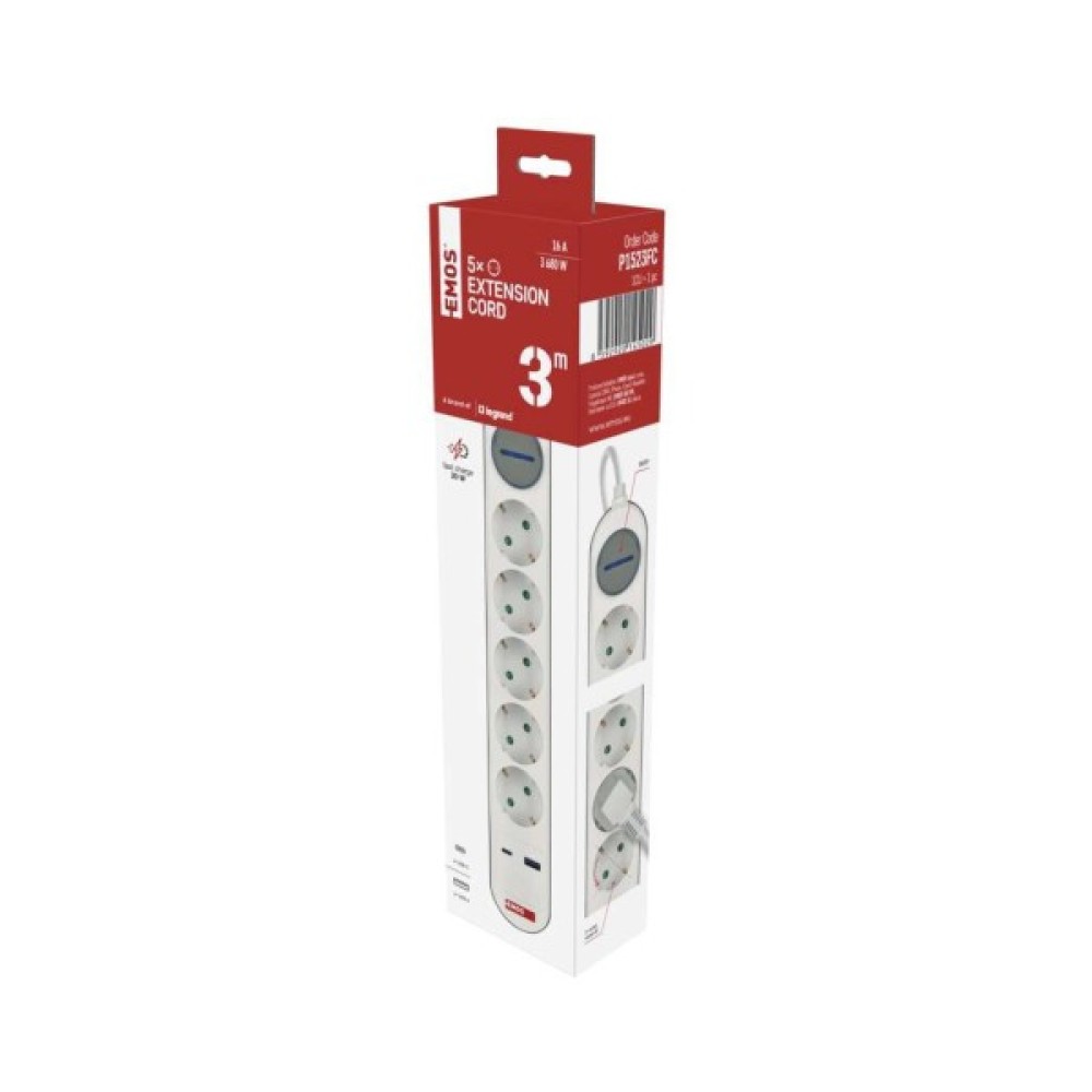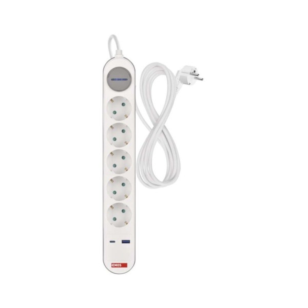 Сучасний подовжувач EMOS P1523FC із 5 розетками та портами USB-A і USB-C, кабель довжиною 3 м. Ідеальний для підключення та зарядки декількох пристроїв у домашньому або офісному середовищі.
