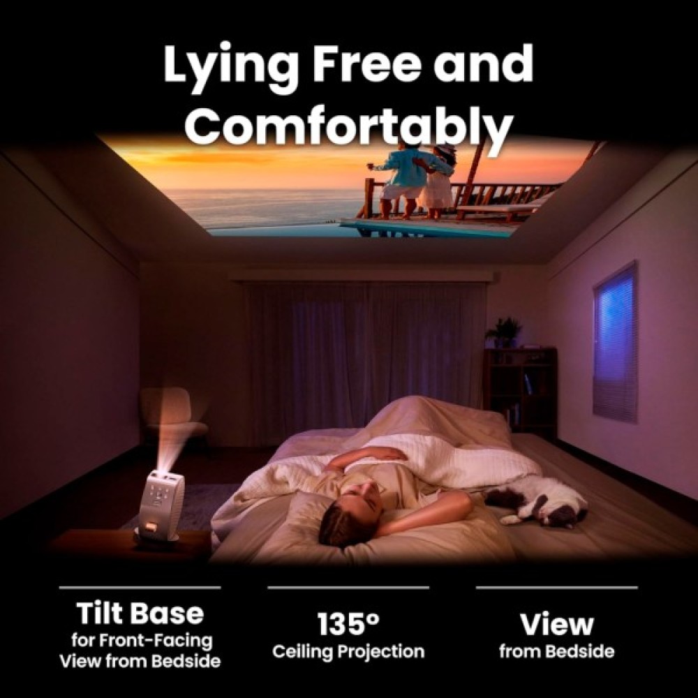 Нахиліть регульовану основу проєктора GV50 для проєціювання з тумбочки біля ліжка, щоб забезпечити оптимальне візуальне позиціювання, не турбуючись про нестабільність, а також звільнити місце на ліжку.