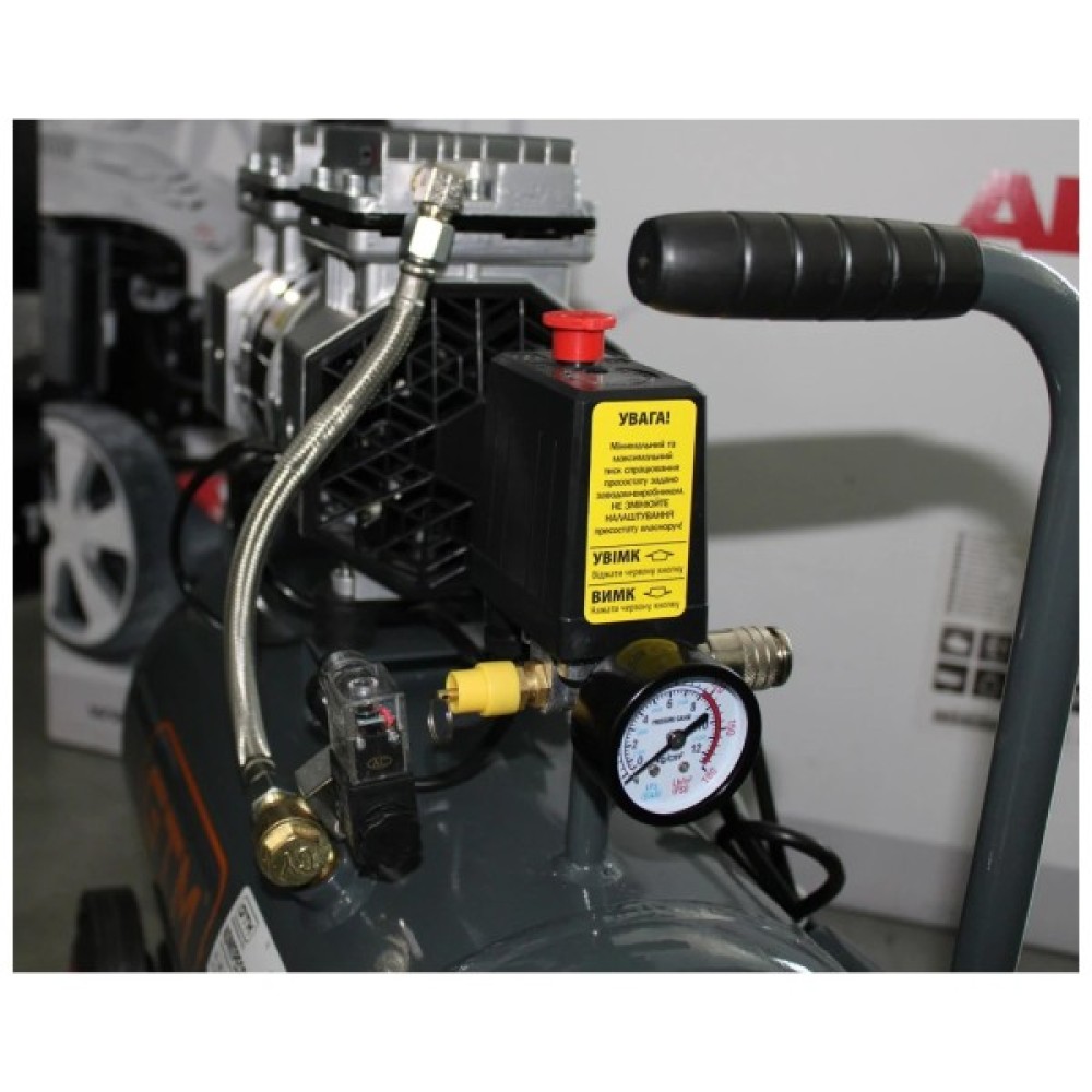 GTM KAW750-24L - надійний і продуктивний безмасляний компресор побутового класу для нагнітання чистого повітря без домішок мастила і конденсату. Завдяки конструкції підходить для завдань, в яких потрібна висока якість повітря на виході: аерографії, медицині, продування відповідальних елементів машин.