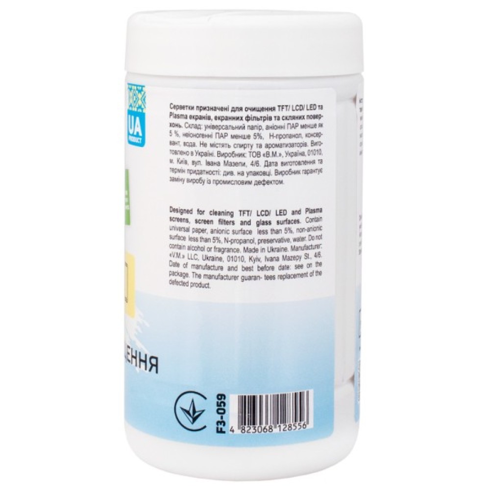 Інструкція з використання. Перед використанням зверніться до інструкції з експлуатації вашого обладнання. Перед очищенням вимкніть пристрій та зачекайте доки екран охолоне. Витягніть центральну серветку через отвір у кришці. Протріть поверхню, яку необхідно очистити. Після використання щільно закрийте кришку туби. Викиньте використану серветку. Берегти від дітей. Зберігати при кімнатній температурі.