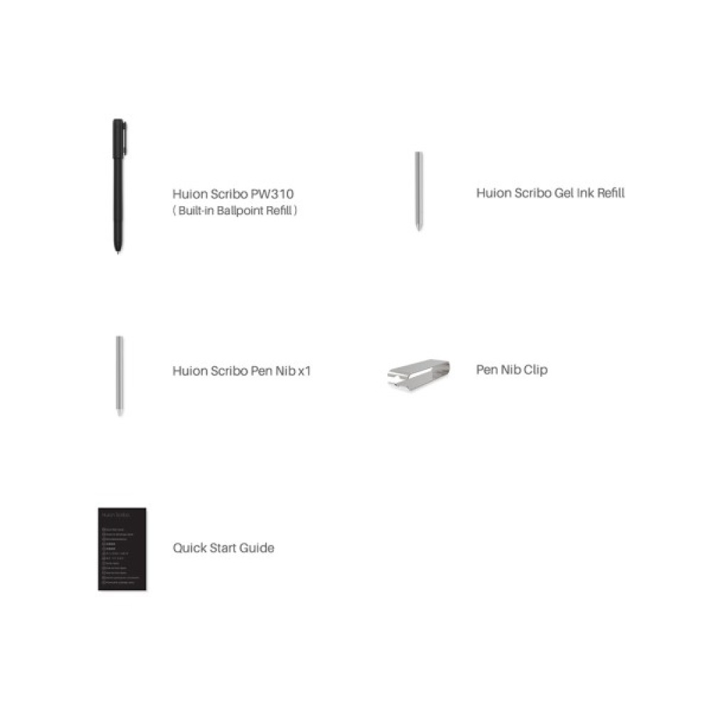 Розроблений для повсякденного використання, Huion Scribo сумісний зі стрижнями гелевих і кулькових ручок, що дає змогу адаптувати їх до різних сценаріїв письма. Крім того, ви можете замінити пластиковий наконечник пера, щоб використовувати Huion Scribo як перо без батареї з 8192 рівнями з графічним планшетом для базового малювання та дизайну.