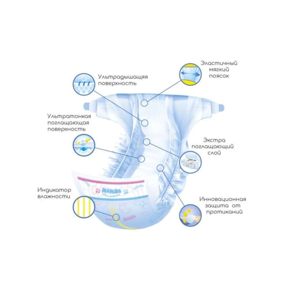 Унікальна супер дихаюча гіпоалергенна система ефективно захищає ніжну шкіру від вологи, висипу і подразнень, що робить їх ідеальним вибором навіть для найчутливіших малюків. Завдяки м'якому розтягуванню навколо талії, підгузки чудово підійдуть навіть для найактивніших діток.