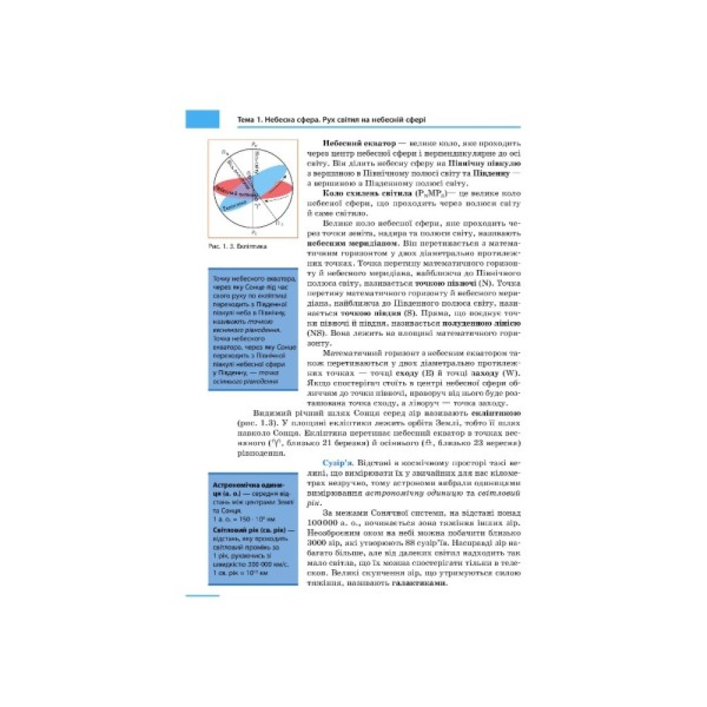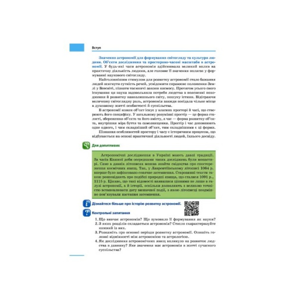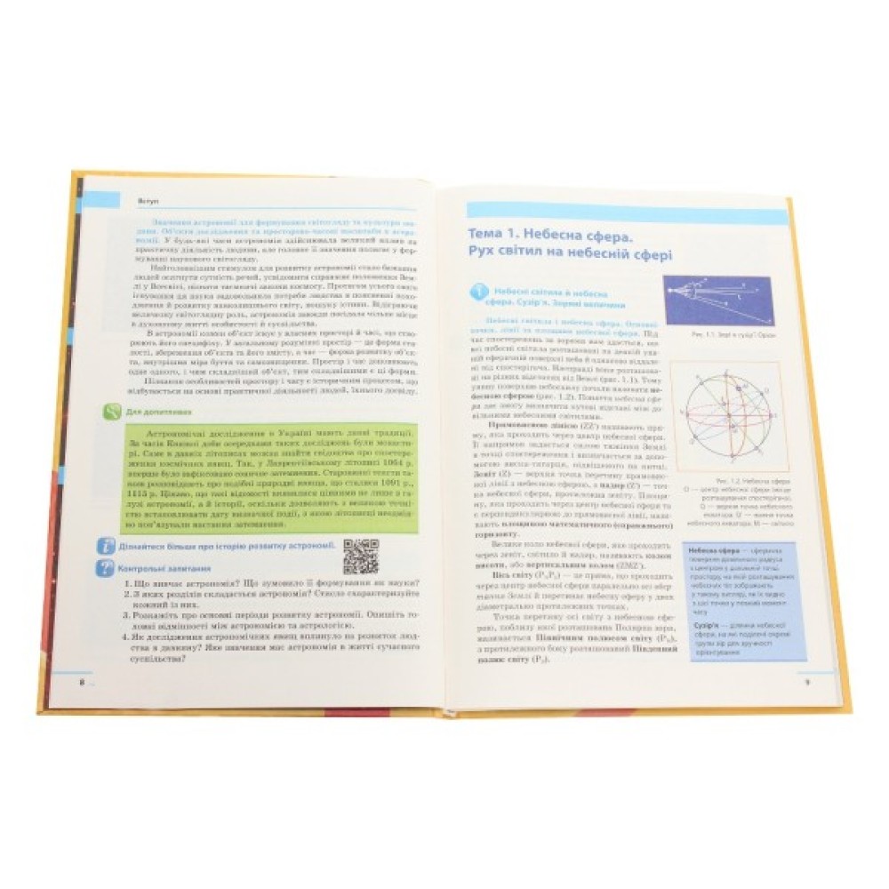 До ряду ілюстрацій є тести для акцентування уваги на астрономічні явища, задоволення інтелектуальних та естетичних запитів учнів, розширення інформативних можливостей підручника через інтернет-матеріали.