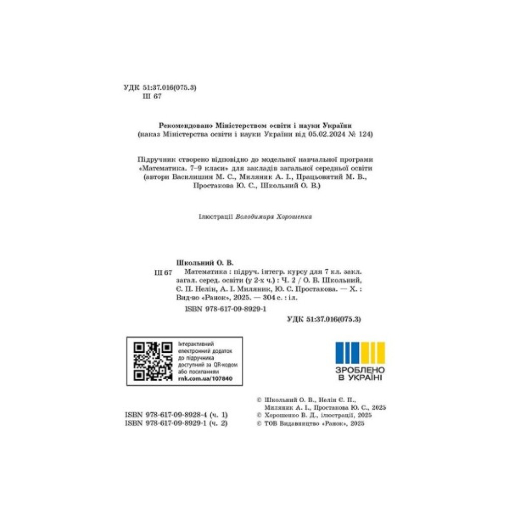 Підручник, Математика, Інтегрований, курс, Для, 7, класу, ЗЗСО, , ч, Частина, 2, Ранок, 9786170989291