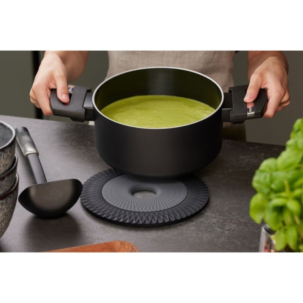 Gefu Circo - це розумна силіконова підставка 2 в 1 для каструль і сковорідок від невеликого до великого розміру. Висока ізоляція та особливий захист від ковзання завдяки спеціальній стільниковій структурі.