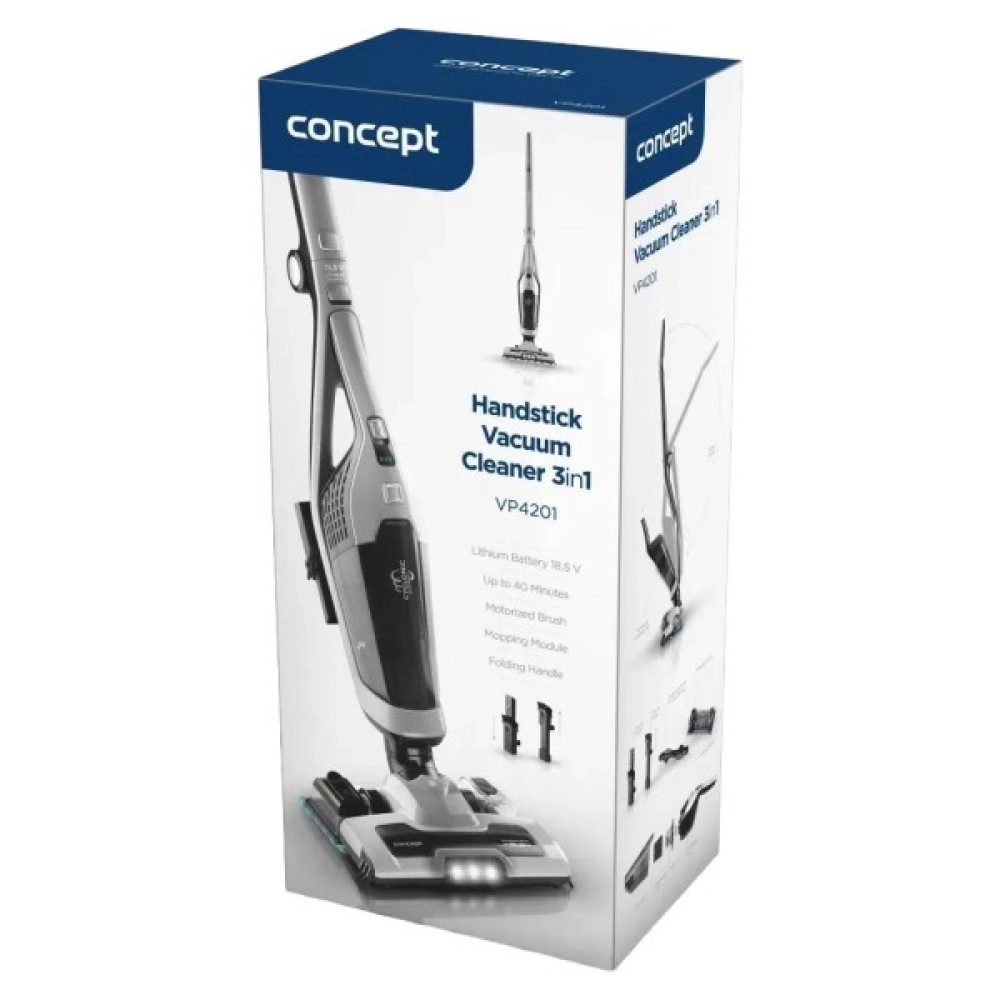 Concept VP4201 оснащено високоякісним літій-іонним акумулятором ємністю 2200 mAh, який дозволяє пилососу працювати без кабелю до 40 хвилин. Це забезпечує свободу руху та тривале прибирання всього дому. Завдяки циклонній системі, пил і бруд швидко збираються у контейнер об'ємом 0.6 л, що забезпечує постійну потужність всмоктування без необхідності використовувати мішки.