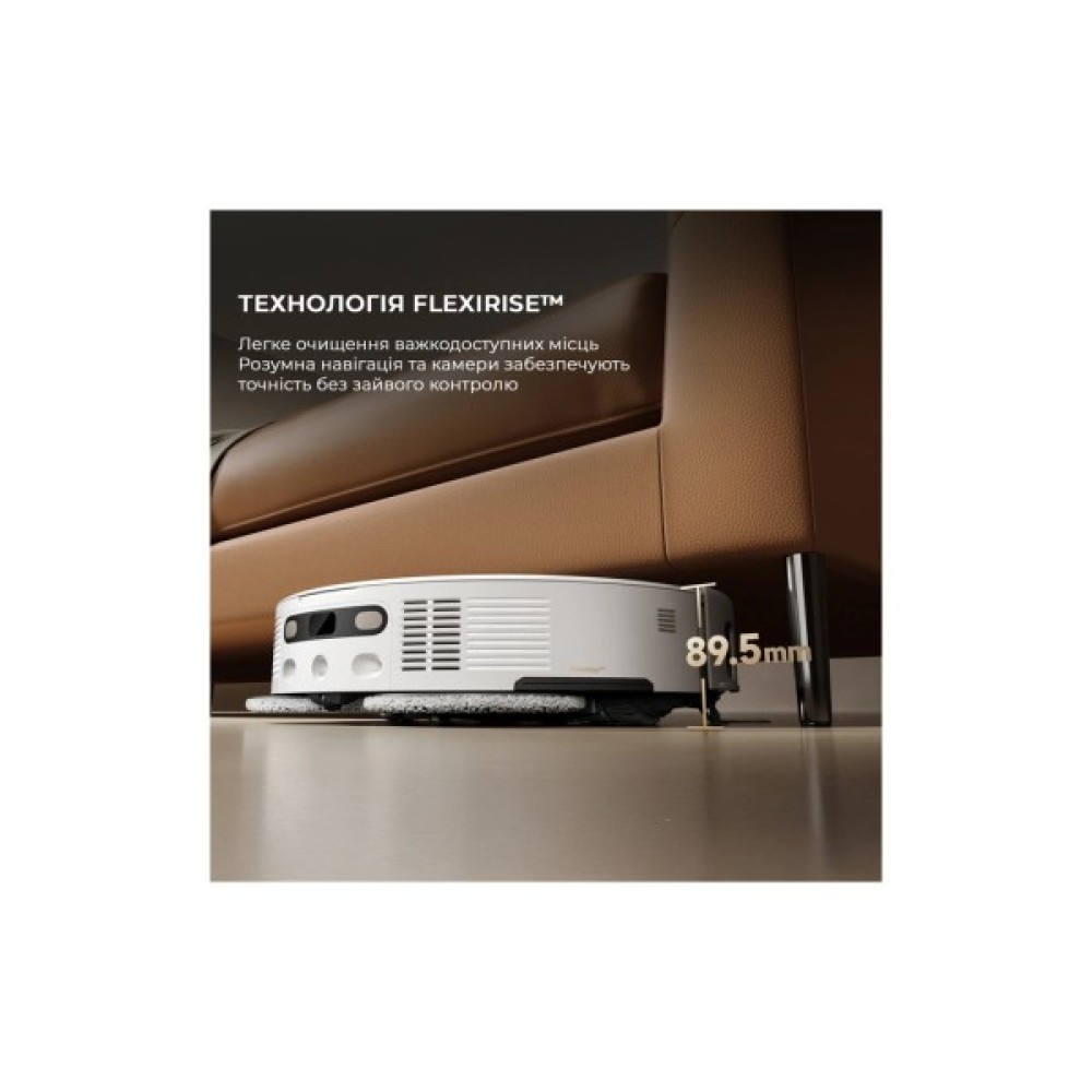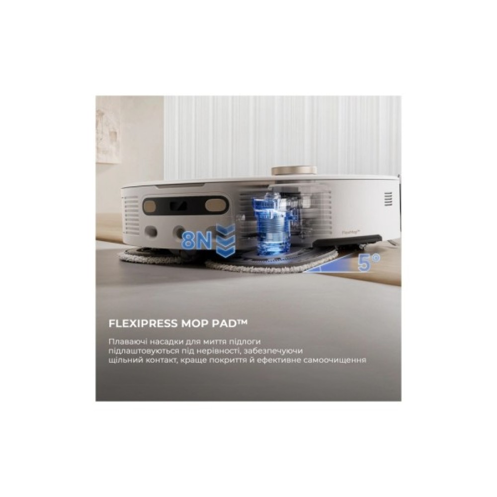 Робот-пилосос Mova V50 Ultra Complete оснащений спеціальною насадкою для вологого прибирання. Система FlexReach дозволяє переміщувати насадку вгору і вниз, регулюючи тиск для максимально ефективного очищення. Унікальна система самообслуговування позбавляє вас потреби постійно наповнювати контейнери для вологого прибирання — розчини в них автоматично поповнюються.