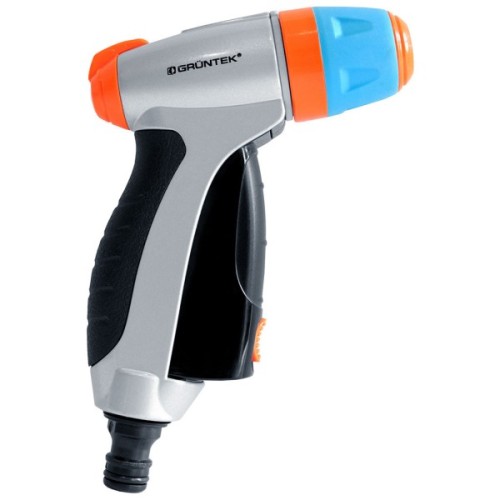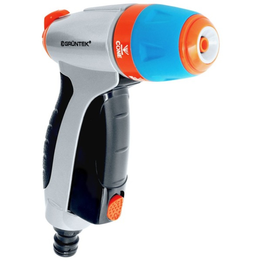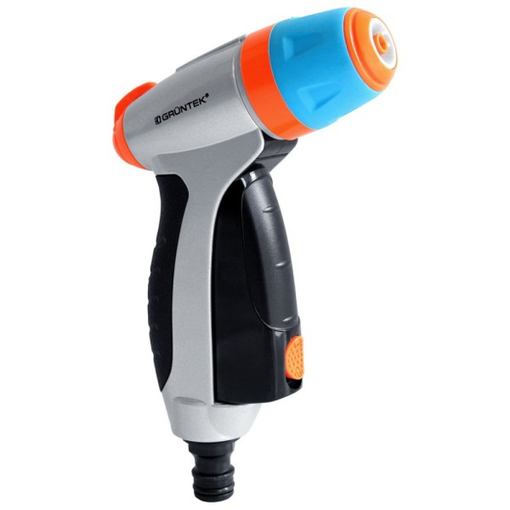 Надійний пістолет Gruntek призначений для ефективного поливу газону, клумб, чагарників, а також для миття садового інвентарю й техніки, для миття машини, для змивання бруду зі сходів і доріжок. Корпус пістолета Gruntek виготовлений із міцного металу, що забезпечує довгий термін експлуатації інструмента. На ручці передбачені прогумовані накладки, які дають пістолету змогу комфортно лежати в руці впродовж усього поливу, а також запобігають ковзанню в процесі роботи.