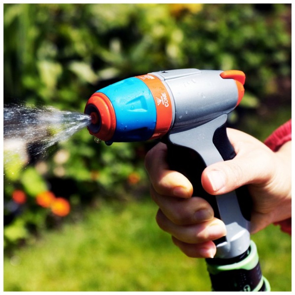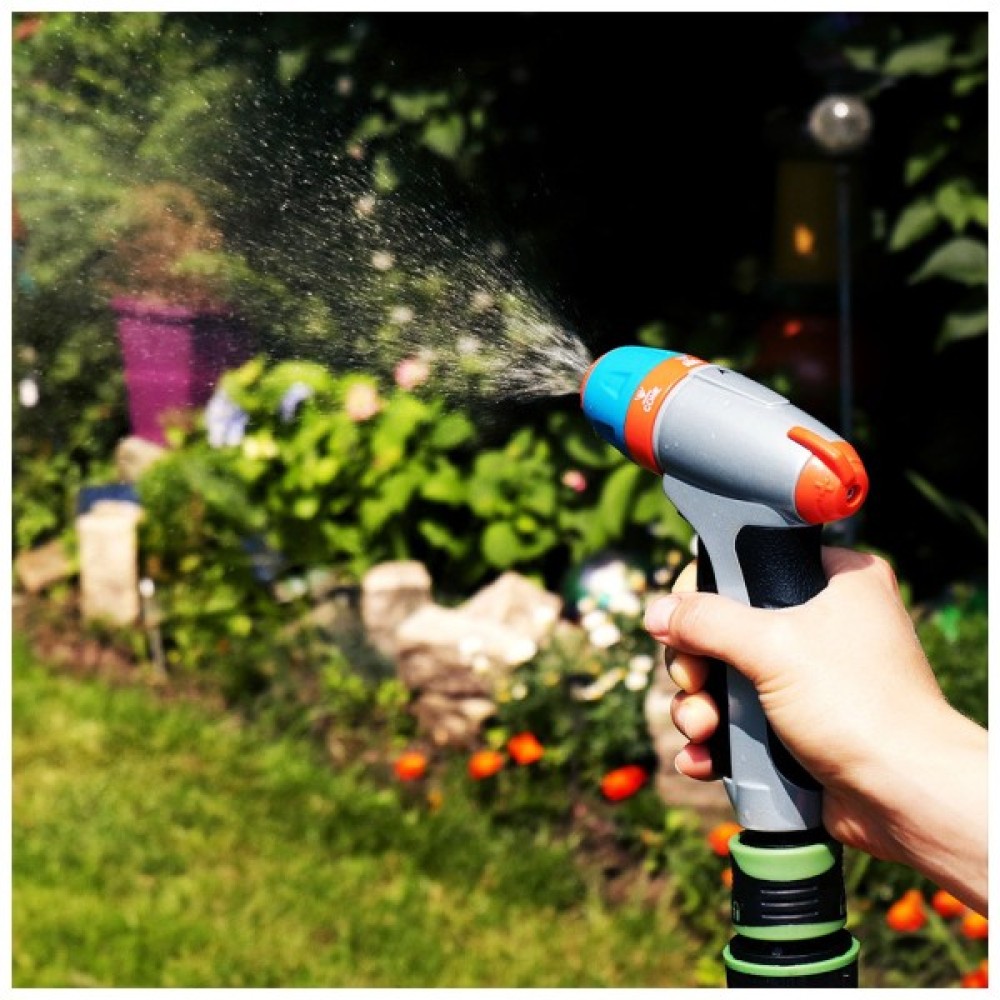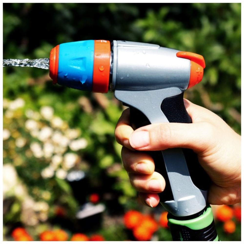 Є можливість зафіксувати кнопку увімкнення, полегшує напругу на руку в процесі поливу. Такий пістолет прискорить процес поливу садових рослин, допоможе під силою напору змити навіть скам'янілий бруд із садового інвентарю й допоможе впоратися з побутовими завданнями на дачній ділянці або в саду.
