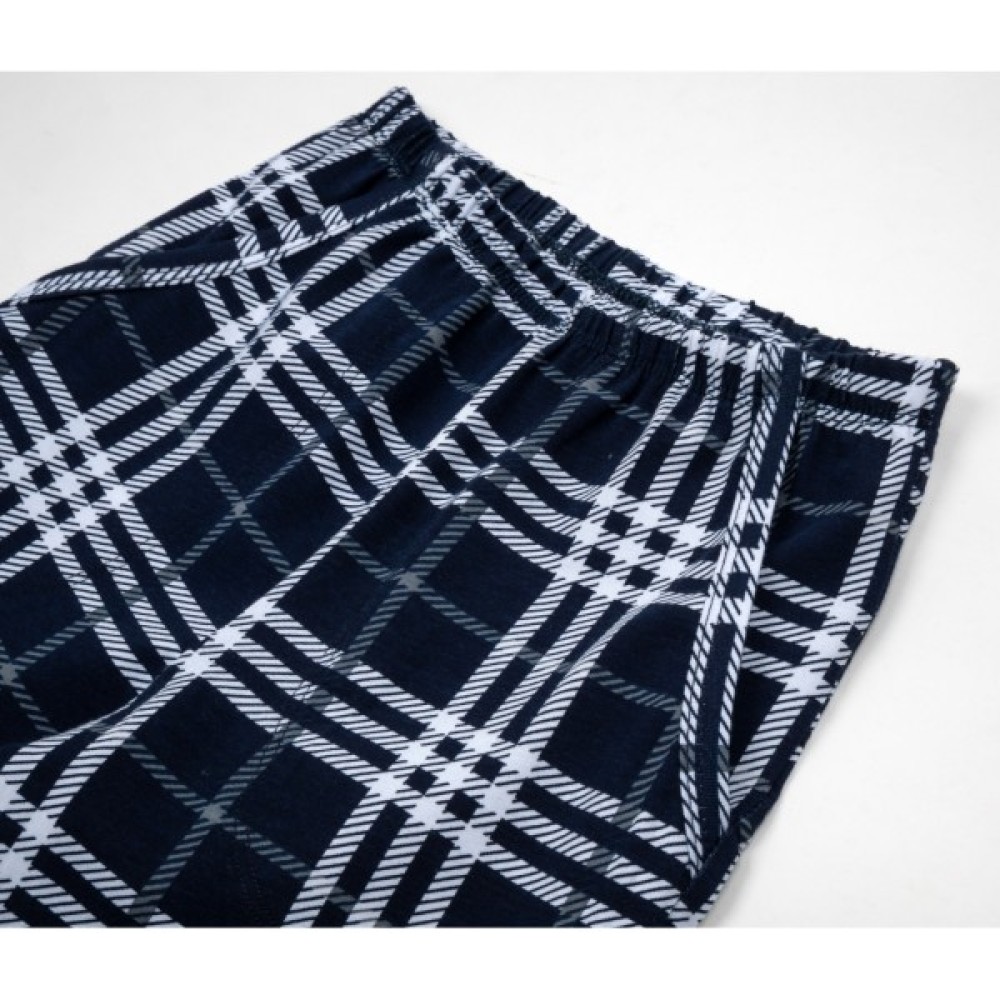 Штани темно - синього кольору у велику клітинку. Крій вільний, прямий, в поясі під резиночку. Посадка висока. Є дві кишені.