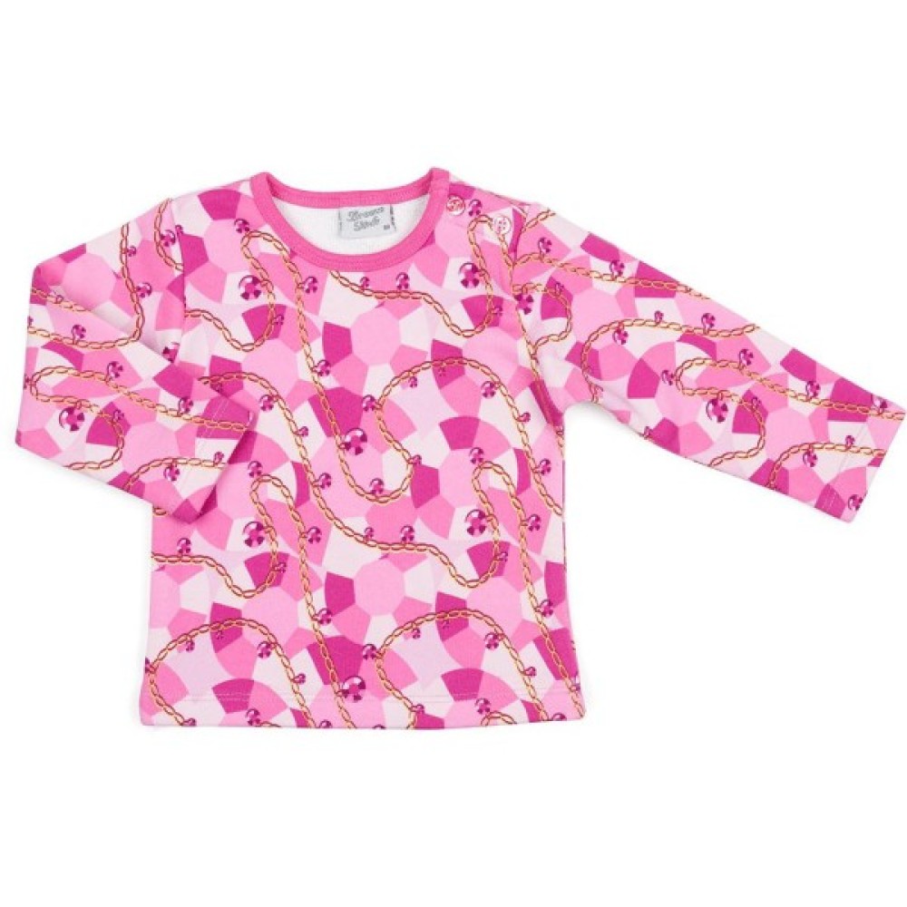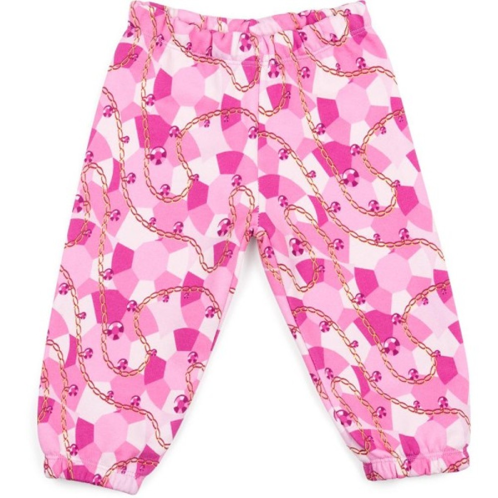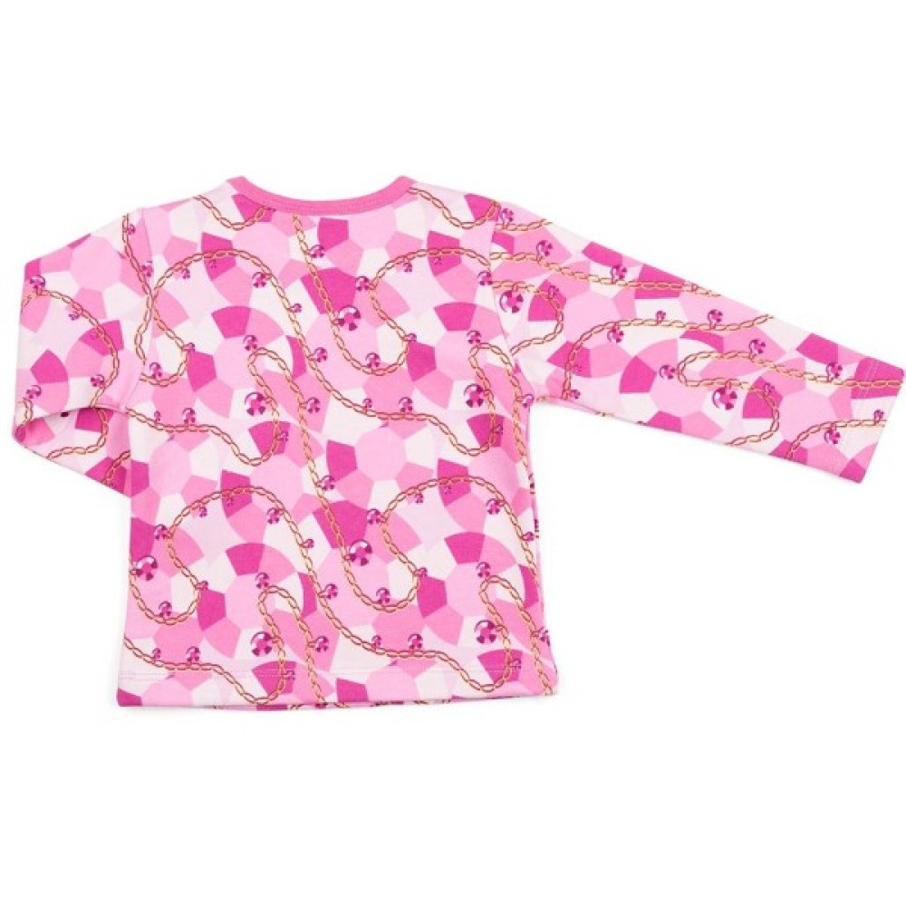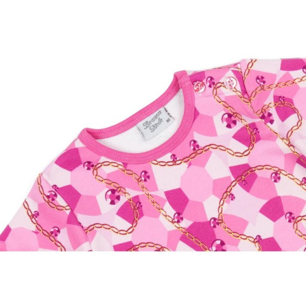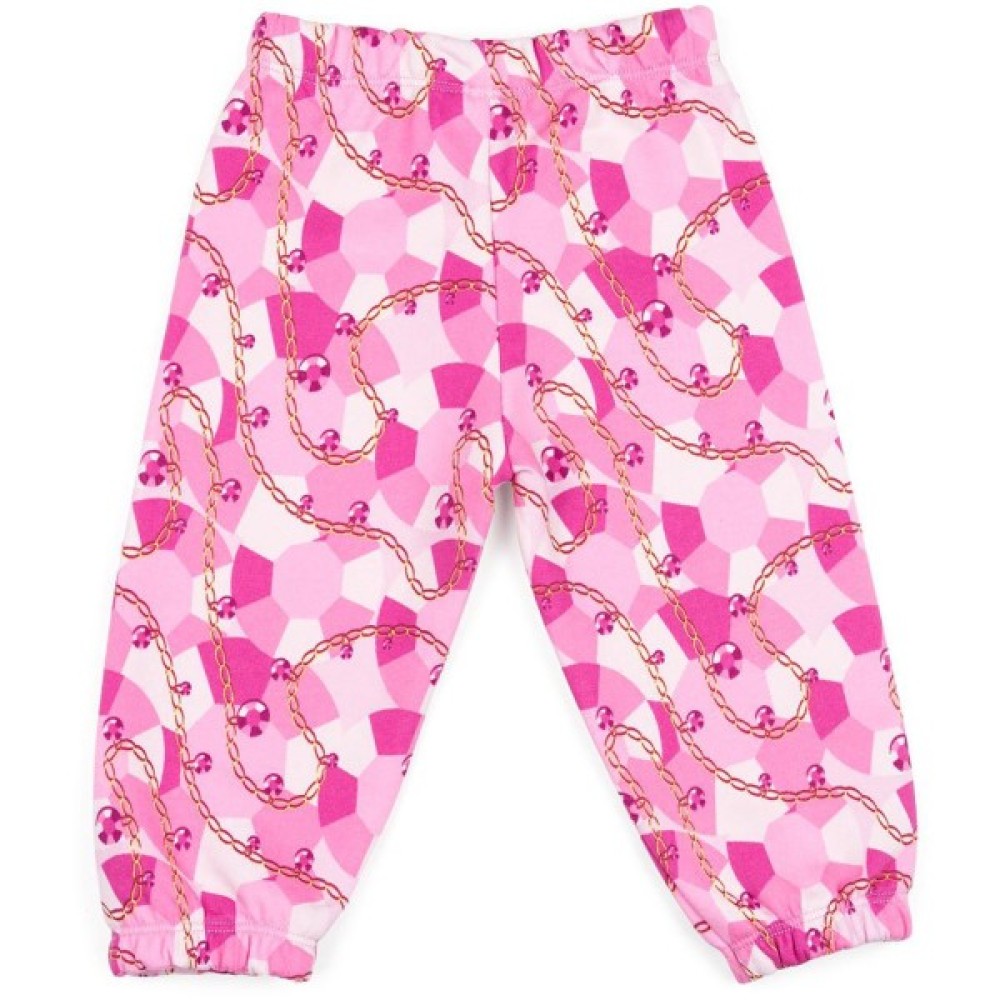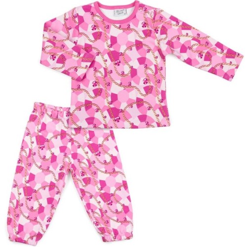 Трикотажна піжама в рожевих тонах із зображенням золотих ланцюжків і коштовних каменів. Піжама виконана з щільного, бавовняного турецького трикотажу з легкою махрою із зворотньої сторони. До складу доданий невеликий % еластану для підтримки форми та підвищення зносостійкості виробу.