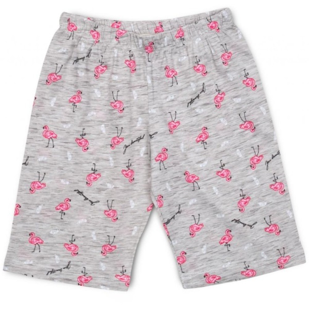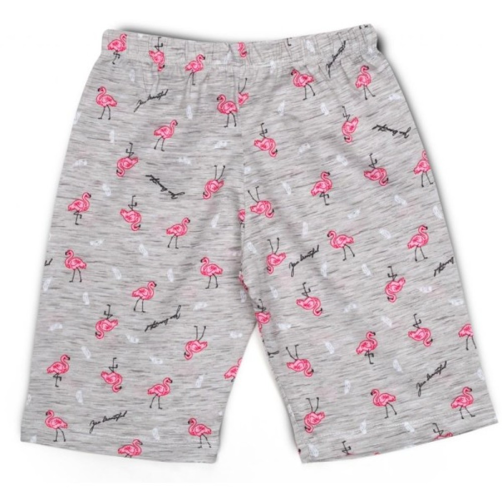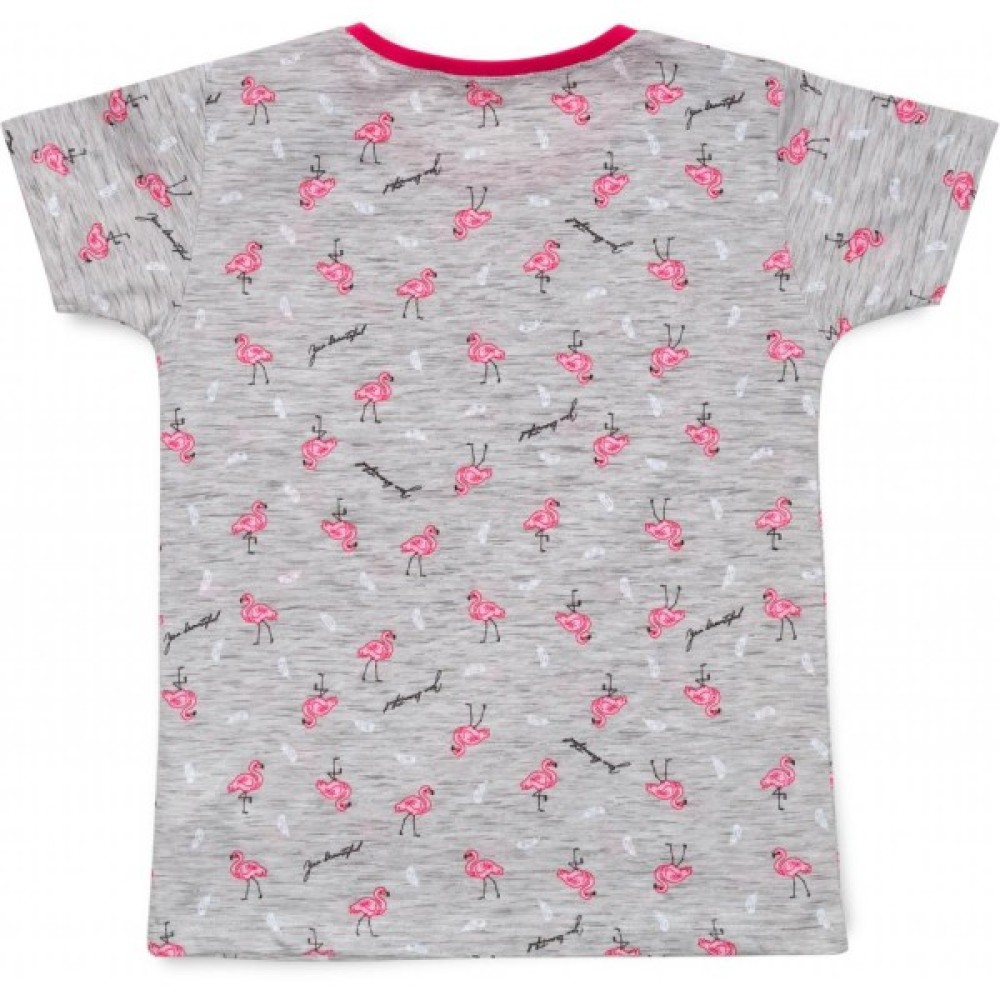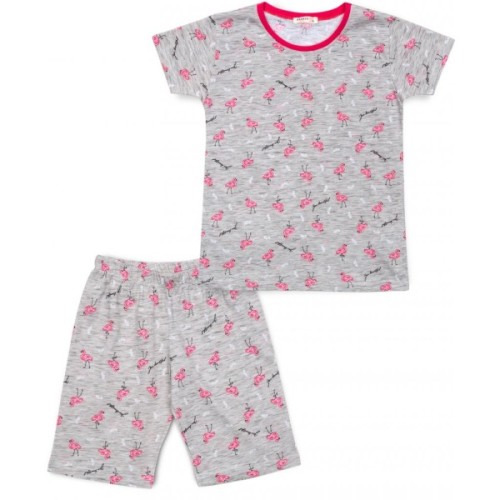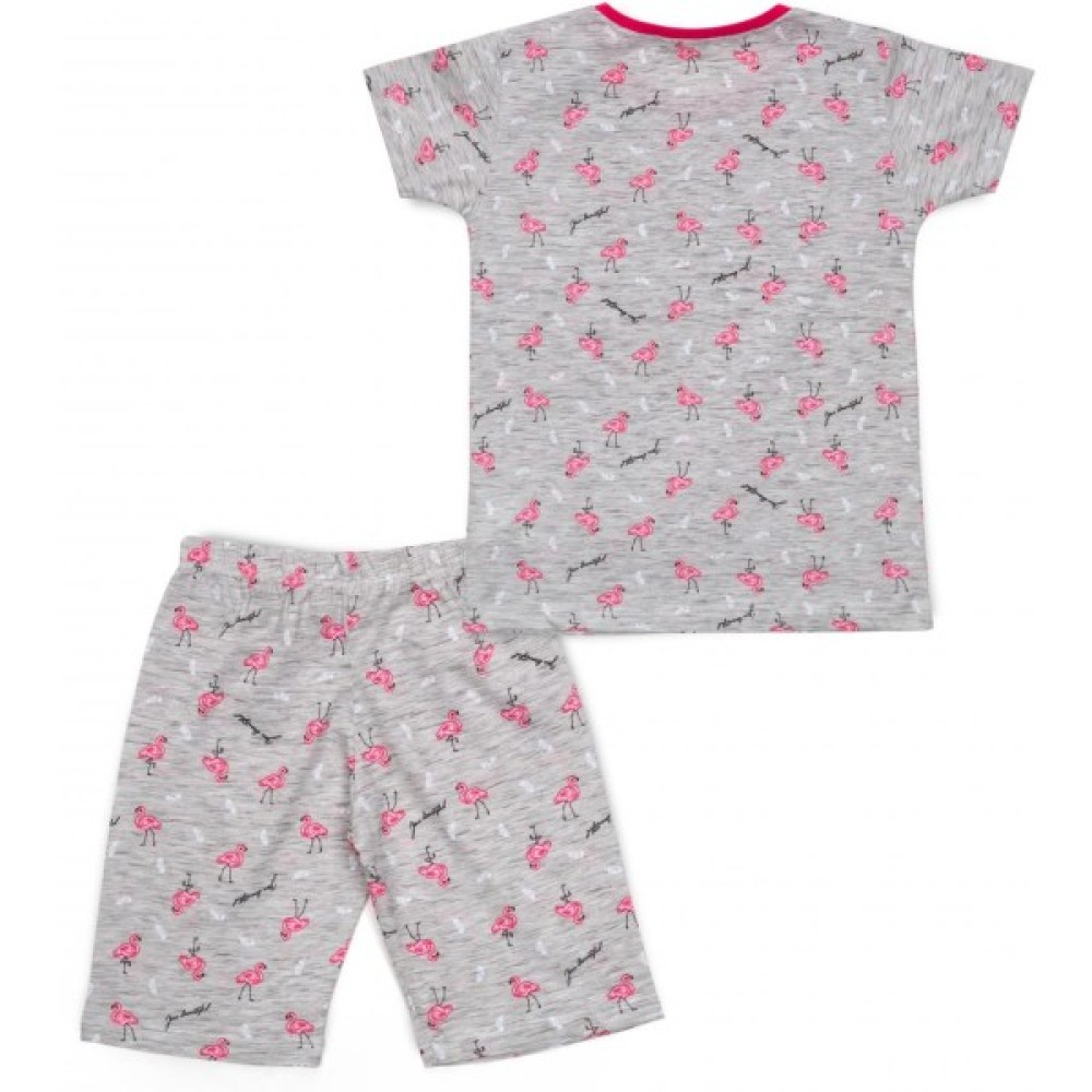 Затишна трикотажна меланжева піжама для дівчинки, приємного світло-сірого кольору у візерунок із симпатичних рожевих фламінго, біленьких пір'їнок і маленьких контрастних написів.