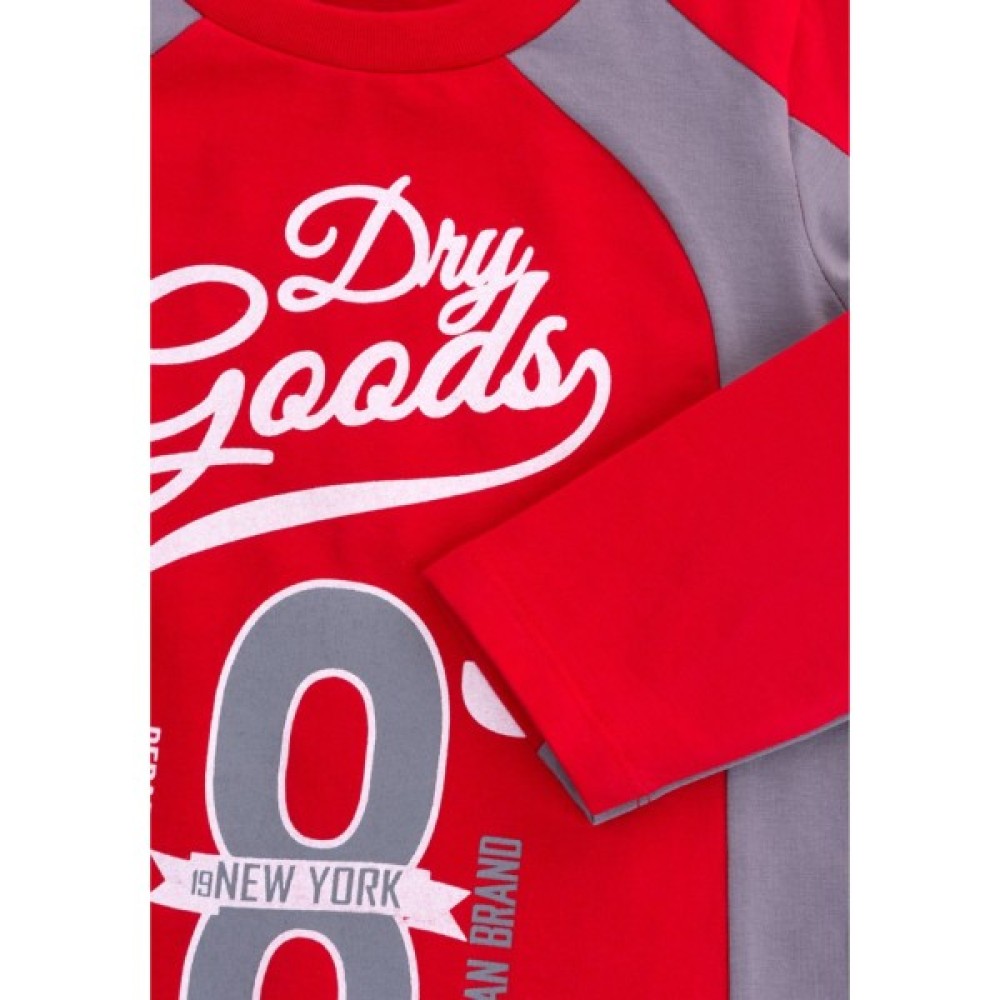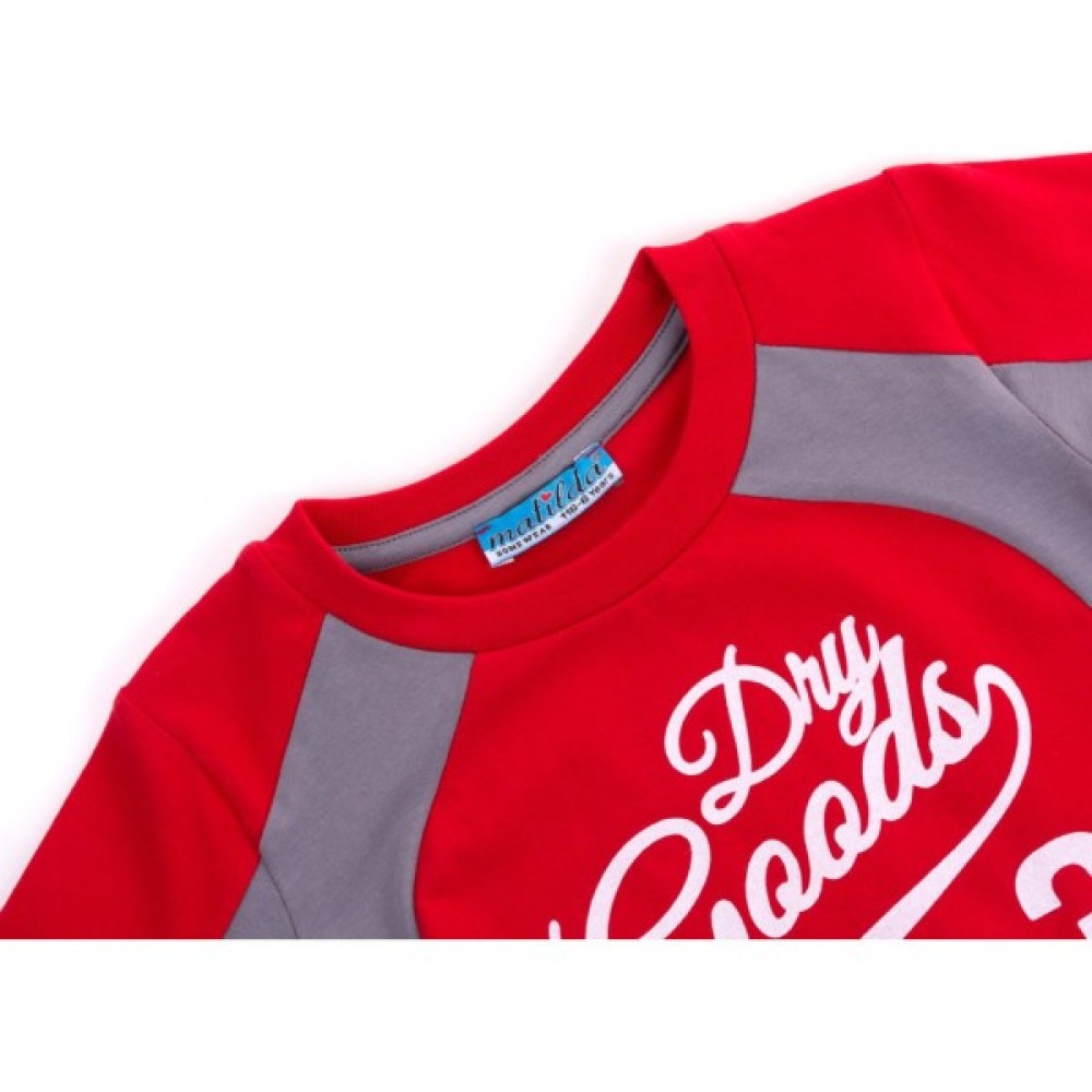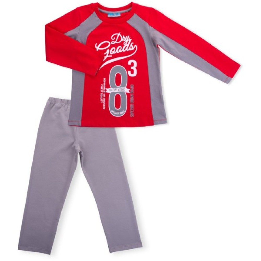 Джемпер прямого силуету, ззаду – однотонного, красивого червоного кольору, а спереду – червоний колір вдало поєднується зі стильним принтом і вставками сірого кольору. Кругла горловина оброблена м'якою подвійною трикотажною резинкою. Вільні, прямі, трохи завужені штани сірого кольору, без манжет і пояс під гумку, забезпечать оптимальну посадку по фігурі. Комплект прикрашений об'ємними стильними принтами на джемпері і таким само, тільки контрастного кольору, на штанях.
