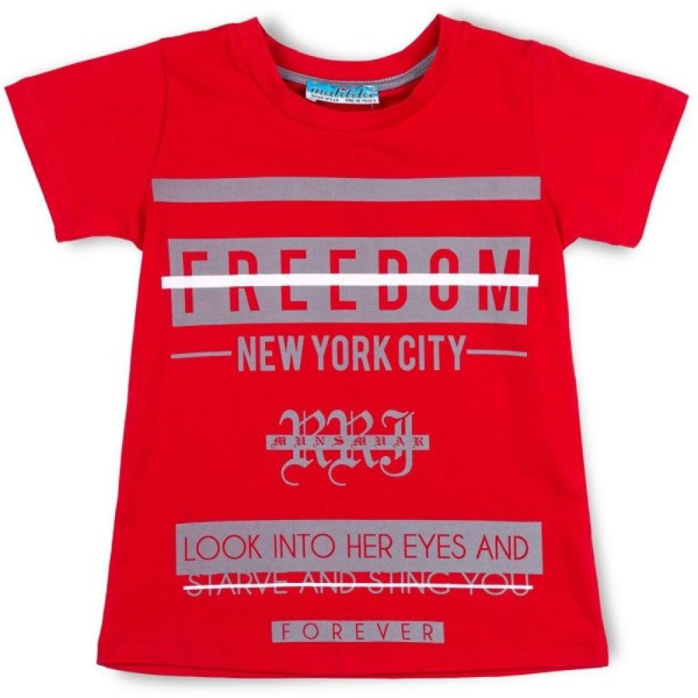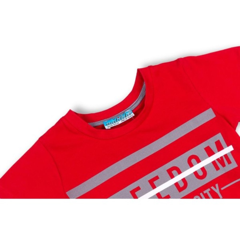 Футболка прямого силуету насиченого червоного кольору. Кругла горловина оброблена трикотажною бейкою. Перёд прикрашений стильним принтом з різноманітних написів.