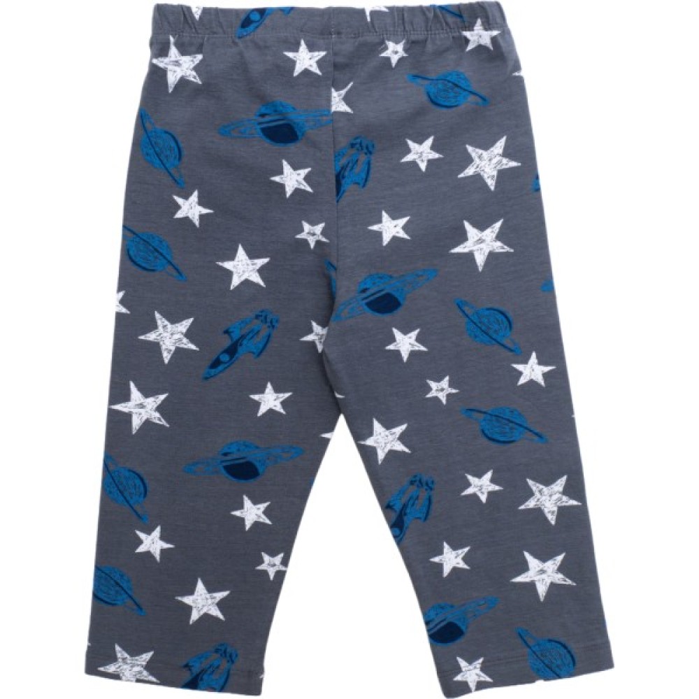 - Штани-капрі сірого кольору в симпатичні принтові малюнки на космічну тематику по всій поверхні. Штани зручні, трохи укорочені, прямі, без манжет, у поясі зібрані на гумку.