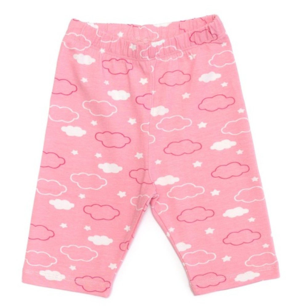 Подовжені вільні капрі, приємного рожевого кольору, під гумку в поясі, забезпечать затишок, комфорт і оптимальну посадку по фігурі. Прикрашені капрі рожевими та білими хмаринками.