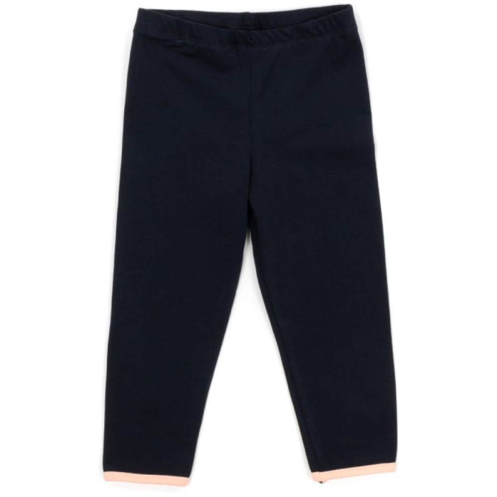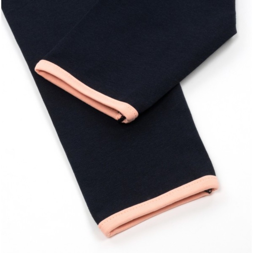 Прямі штанці темно - синього кольору, вільного крою, без манжет. Знизу оброблені бейкою персикового кольору ( в тон джемпера).