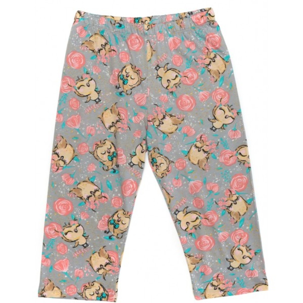 Подовжені вільні капрі, під гумку в поясі, забезпечать затишок, комфорт та оптимальну посадку по фігурі. Капрі приємного світло-сірого кольору. Прикрашені красивими рожевими квітами та совушками.