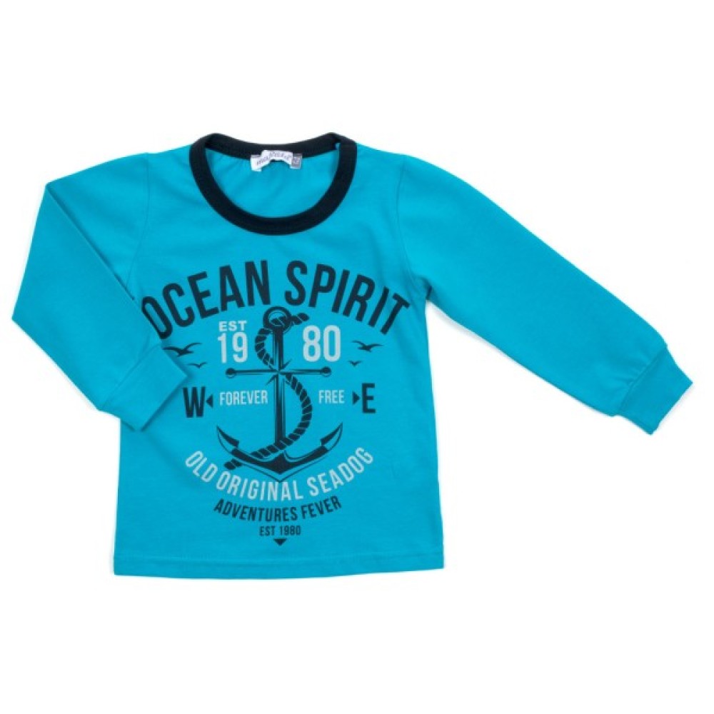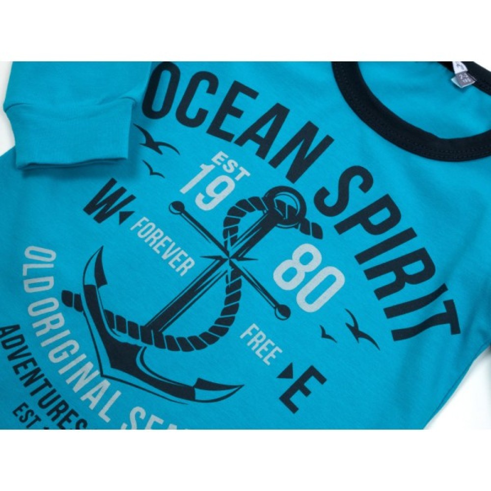 Джемпер насиченого бірюзового кольору, прямого силуету. Спереду прикрашений принтом якоря і написами. Горловина з круглим вирізом оформлена трикотажной бейкой чорного кольору. Рукава довгі, внизу на манжеті.