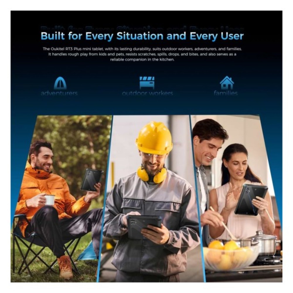 Однією з його головних переваг є захищений корпус, який дозволяє планшету без проблем витримувати складні умови експлуатації, будь то подорожі чи активація на природі. Незважаючи на міцність, OUKITEL RT3 Plus залишиться зручним і компактним завдяки своєму 8-дюймовому дисплею з IPS (PLS) матрицею. Роздільна здатність 1280 х 800 забезпечує яскраве і чітке зображення, що робить його ідеальним для перегляду мультимедійного контенту або роботи з документами.