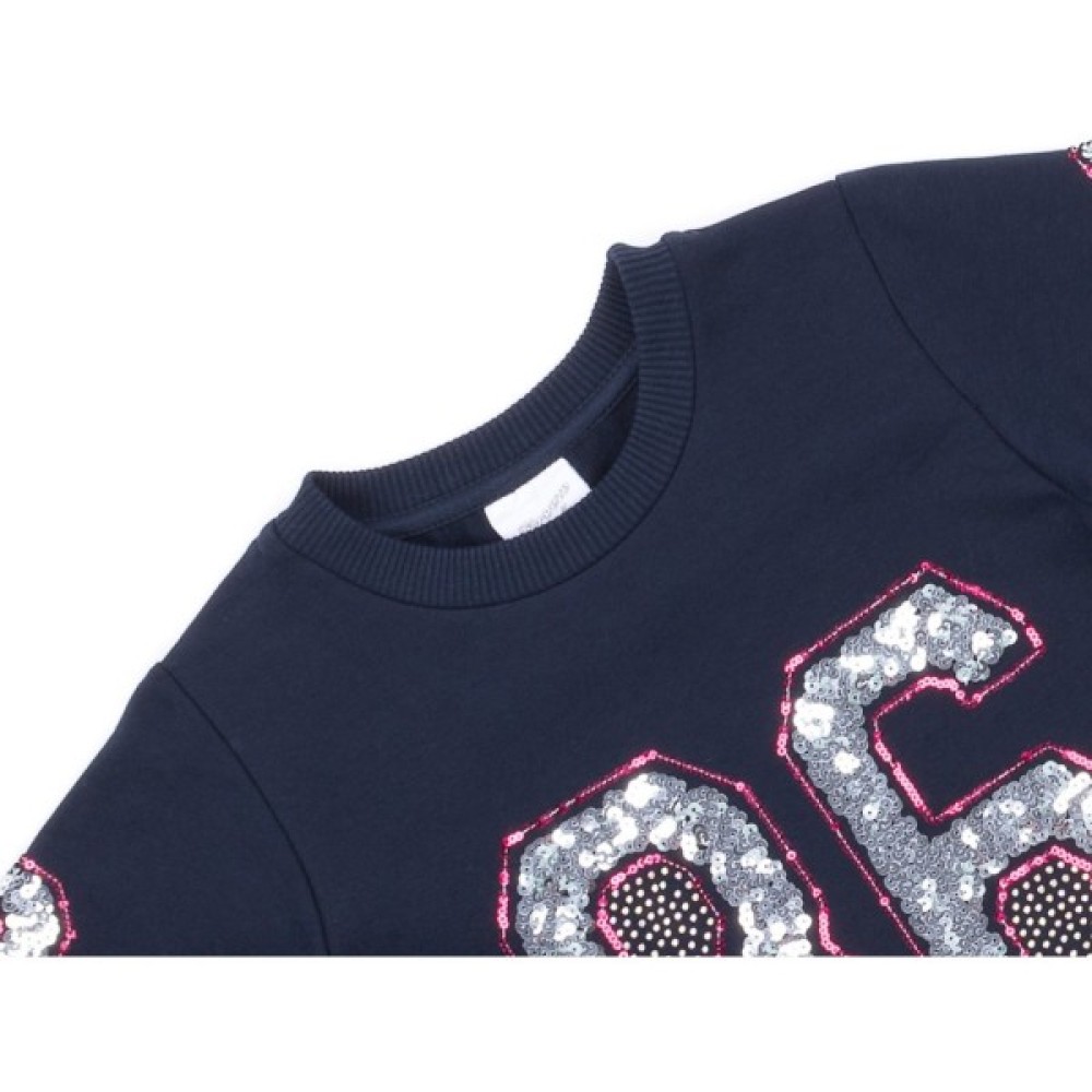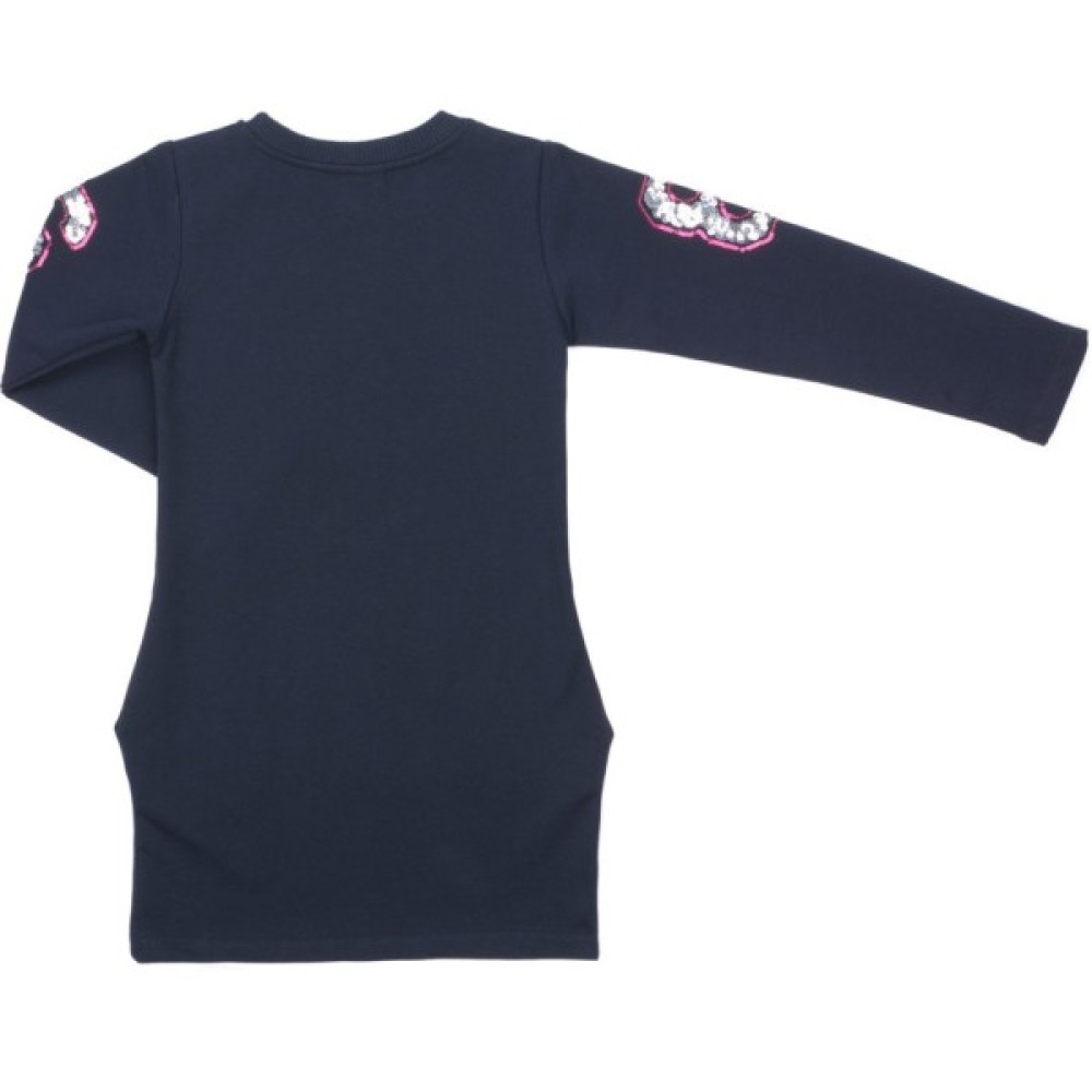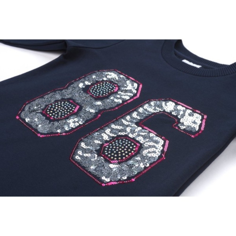 Комфортне, полупрілегаючого силуету плаття, з довгим рукавом глибокого темно-синього кольору. Виконано з м'якого, середньої щільності двохниткового турецького трикотажу, з додаванням невеликого % еластану для підтримки форми (сезони: осінь, зима, весна). Модна і зручна модель, розширена в області стегон, з невеликими кишеньками в бічних швах. На грудях плаття прикрашає яскрава об'ємна аплікація (цифра 86) з паєток сріблястого кольору, обрамлена контуром малинового кольору. Усередині цифри прикрашені перламутровими полубусінамі. Аплікація є і на рукавах.