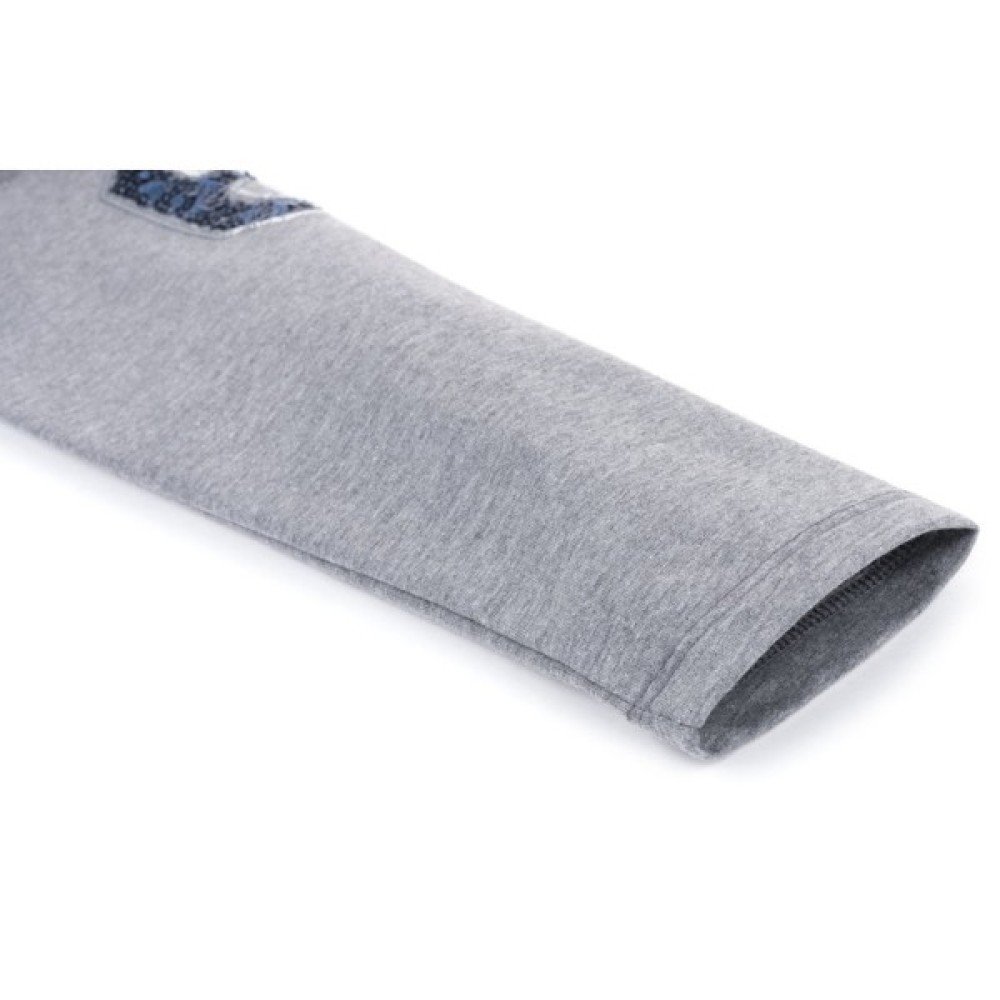 Комфортне, полупрілегаючого силуету плаття, з довгим рукавом сірого меланжеого кольору. Виконано з м'якого, середньої щільності двохниткового турецького трикотажу, з додаванням невеликого % еластану для підтримки форми (сезони: осінь, зима, весна). Модна і зручна модель, розширена в області стегон, з невеликими кишеньками в бічних швах. На грудях плаття прикрашає яскрава об'ємна аплікація (цифра 86) з паєток кольору "морської хвилі", обрамлена контуром сріблястого кольору. Усередині цифри прикрашені перламутровими полубусінамі. Аплікація є і на рукавах.