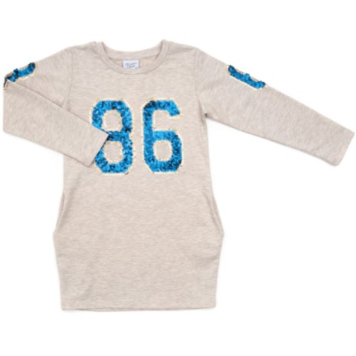Модна та зручна модель, розширена в області стегон, з невеликими кишеньками у бокових швах. На грудях сукню прикрашає яскрава об'ємна аплікація (цифра 86) з пришивних паєток темно - синього кольору, облямована контуром з паєток золотистого кольору. Усередині цифри прикрашені перламутровими напівнамистинками. Аплікація є на рукавах.