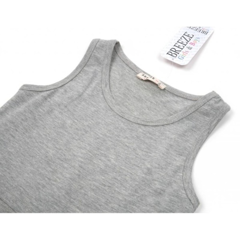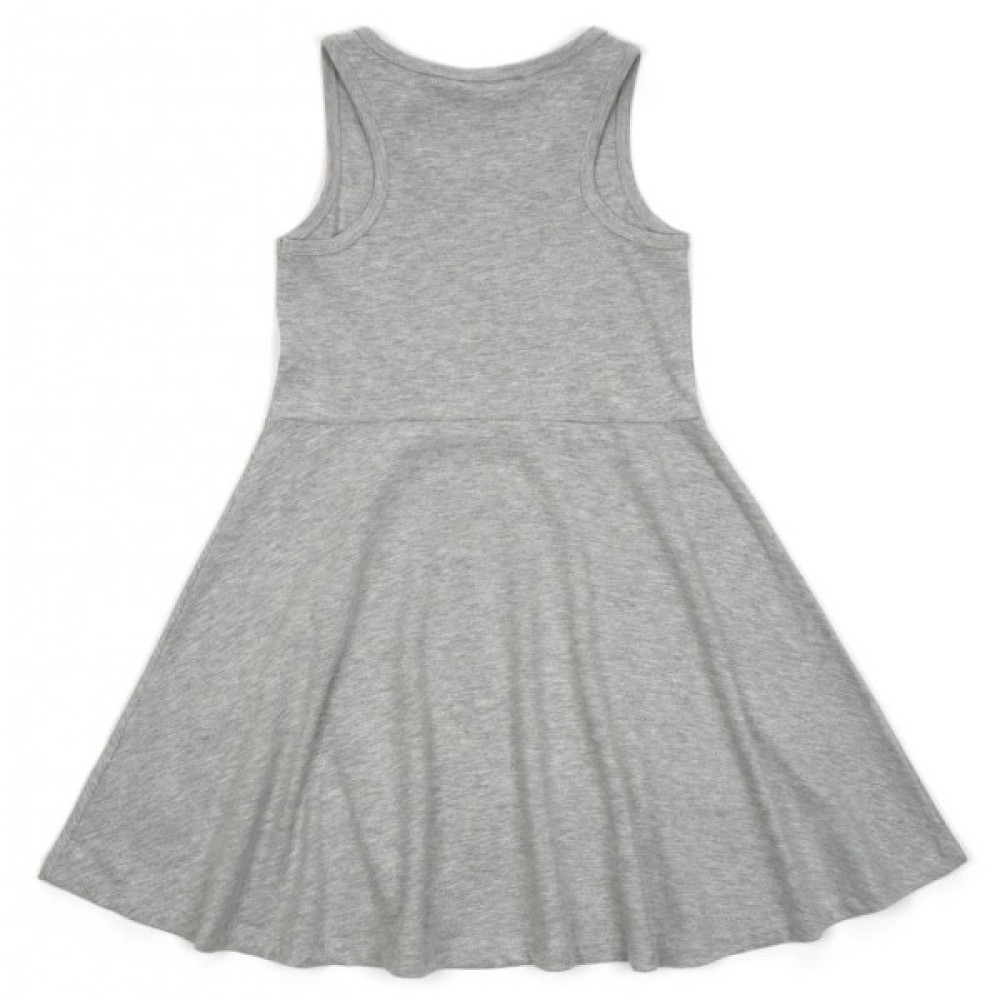 Сукня приємного світло - сірого меланжевого кольору, без рукавів, відрізна по лінії талії. Верх маечного типу, спинка - борцовка - не дуже вузька, в районі лопаток ширина 15 см. Пройми і горловина оброблені еластичною бейкою з такого ж трикотажу. Трикотаж середньої щільності, не просвічується.