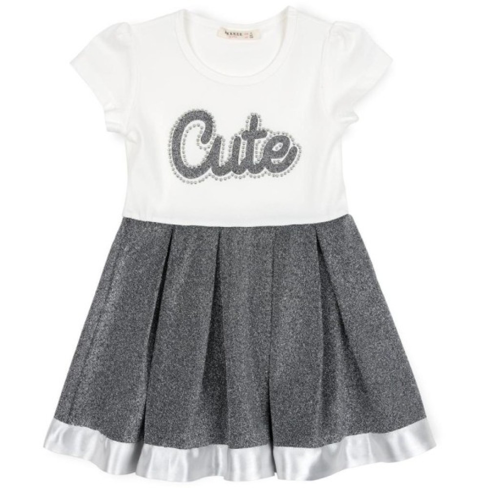 Верх сукні молочного кольору, прямого силуету. Прикрашено на грудях аплікацією слова «Cute» срібного кольору. Рукава короткі, красиво призборені по окату. Горловина овальна, окантована еластичною трикотажною бейкою.