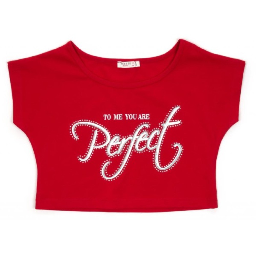 • Топ - укорочена широка футболка насиченого червоного кольору, з суцільнокроєним коротким рукавом і трохи поглибленим вирізом горловини, що дає можливість, при бажанні, приспустити топ з одного плеча. Прикрашений яскравим принтом «Perfect», контур якого оформлений білими стразами. Тканина топа трохи щільніше, ніж у сукні.