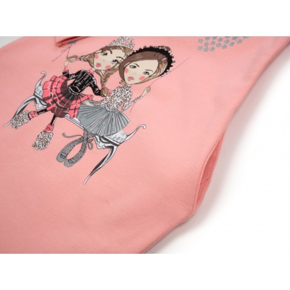 Прикрашає сукню кольоровий принтовий малюнок двох подружок, доповнений легким глітерним напиленням. Цей самий малюнок, тільки вигляд ззаду, повторюється і на спинці сукні.