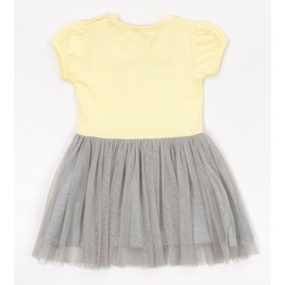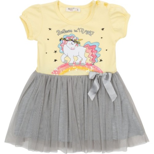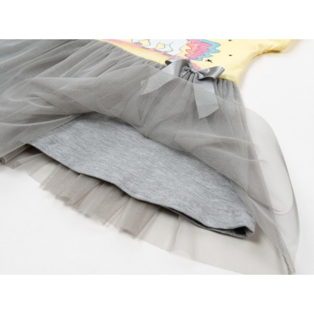 • Верх сукні пастельного ніжно-жовтого кольору, прикрашений яскравим і ефектним принтовим малюнком одноріжка на веселці в оточенні зірочок, з додаванням сріблястого глітера та напівпрозорих голографічних паєток. Кругла горловина окантована еластичною трикотажною бейкою. Короткі рукавчики красиво призібрані по окату та низу.