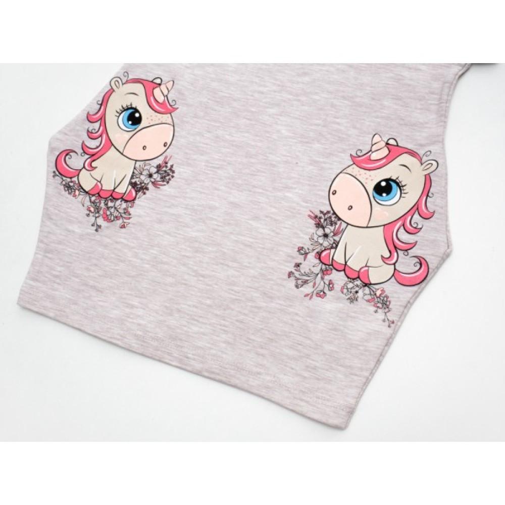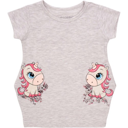 • Симпатична, комфортна меланжева трикотажна сукня-туніка бежевого кольору, з короткими рукавами, прикрашена кольоровими принтовими малюнками двох симпатичних одноріжків спереду, в районі кишень, яка без всяких сумнівів сподобається вашій донечці.