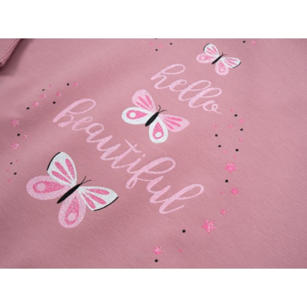 • Сукня вільного, прямого силуету, прикрашена спереду об'ємним, симпатичним принтовим малюнком, красиво доповненим сяючими глитерними блискітками. Рукава довгі, вшивні, з манжетами. Горловина, манжети рукавів і лінія низу (талії) верхньої частини сукні оформлені щільною, якісною подвійною трикотажною резинкою - якісна рібана. Спідниця подвійна - основа трикотаж, верхній шар - м'який, дуже приємний на дотик фатин.