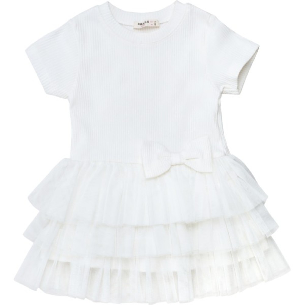 • Симпатична та дуже мила сукня молочно-білого кольору, з трохи заниженою лінією талії та ярусною фатиновою спідничкою для вашої улюбленої модниці!