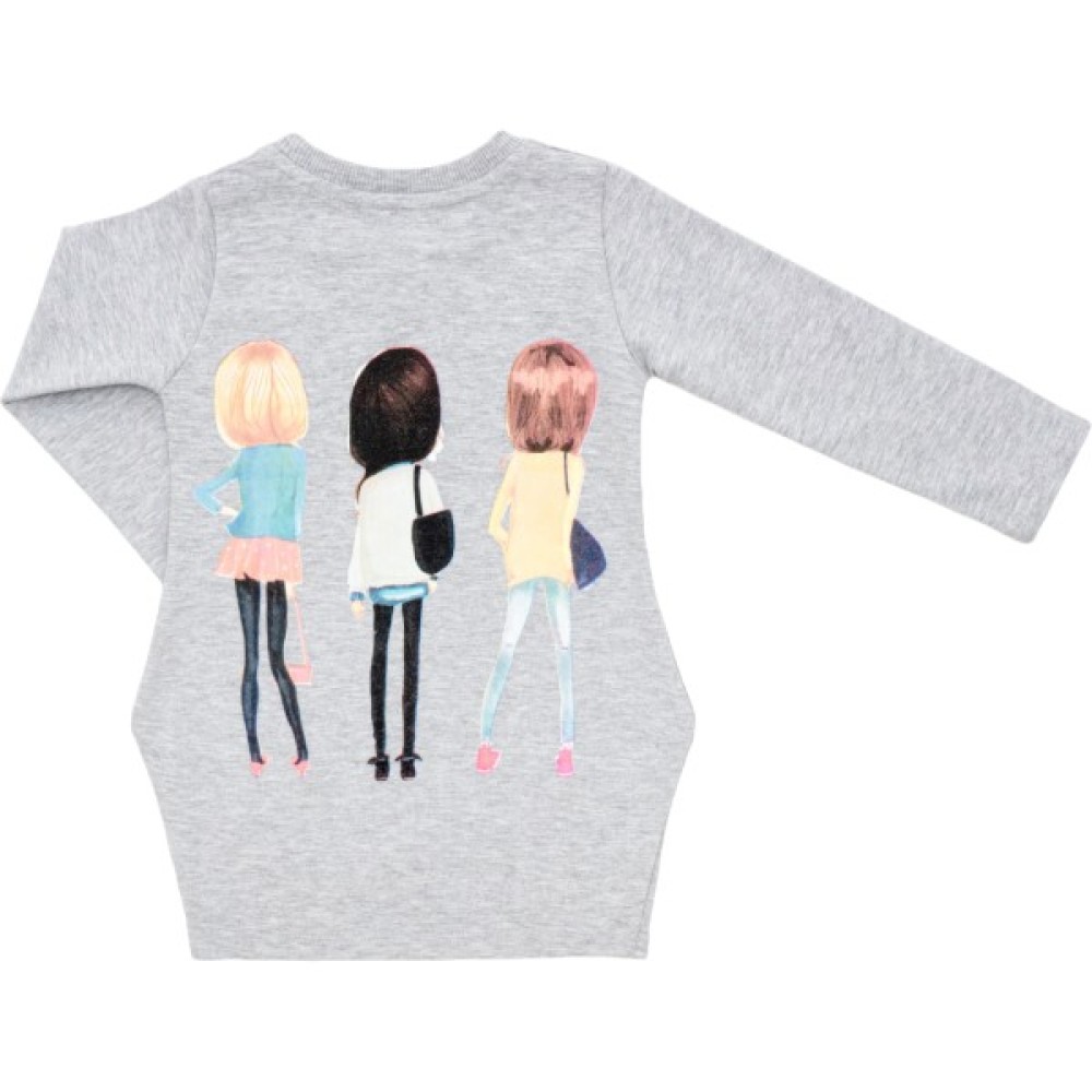 • Симпатична, комфортна меланжева трикотажна світло-сіра сукня-туніка з довгими рукавами, прикрашена ефектним об'ємним кольоровим принтовим малюнком модненьких дівчаток-подружок спереду та на спинці, яка без всяких сумнівів сподобається вашій донечці.