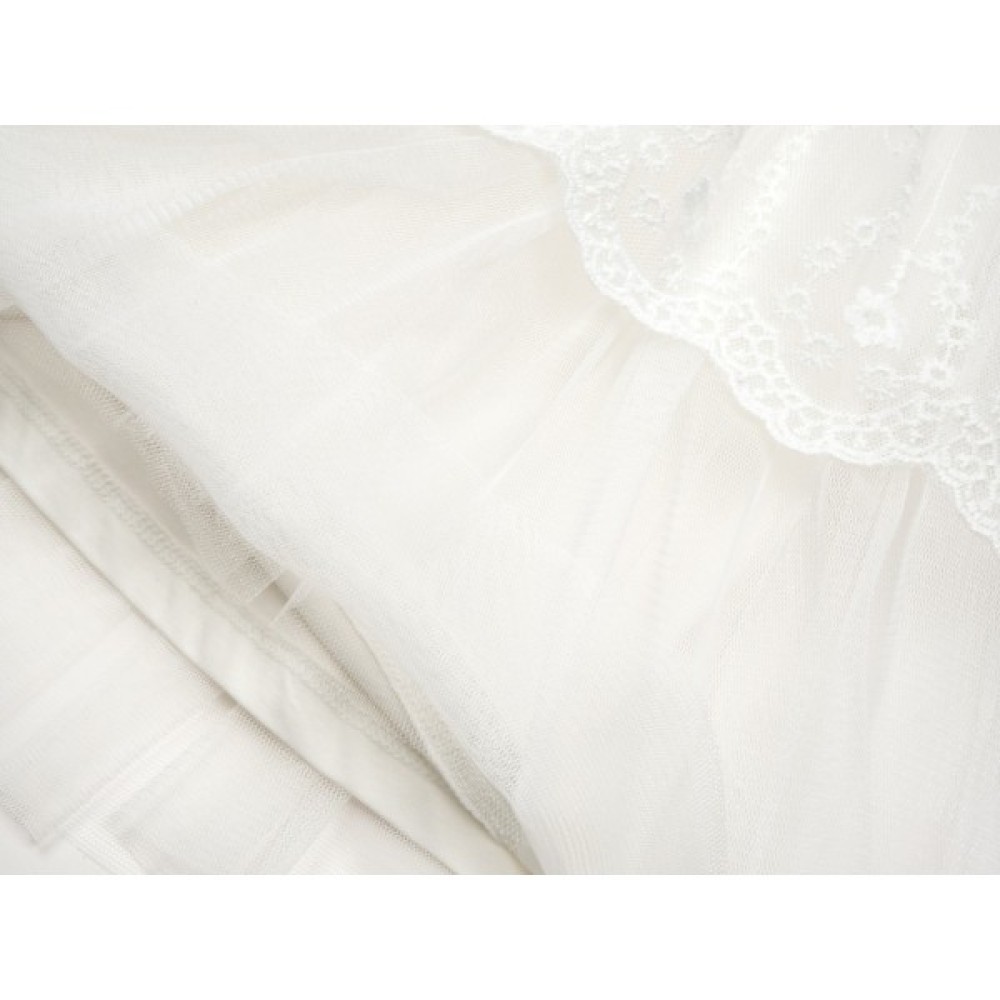 Спідниця сукні призібрана по лінії талії, 2-о шарова. Знизу бавовняний трикотаж, поверх трикотажу шар м'якого фатину. Перед прикрашений неширокою і дуже красивою мереживною оборкою-баскою шириною 13 см, вишитою ніжним квітковим орнаментом. Лінія з'єднання верху сукні зі спідницею еластична, добре тягнеться, завдяки вставленій резиночці, і не завдасть незручностей при одяганні.