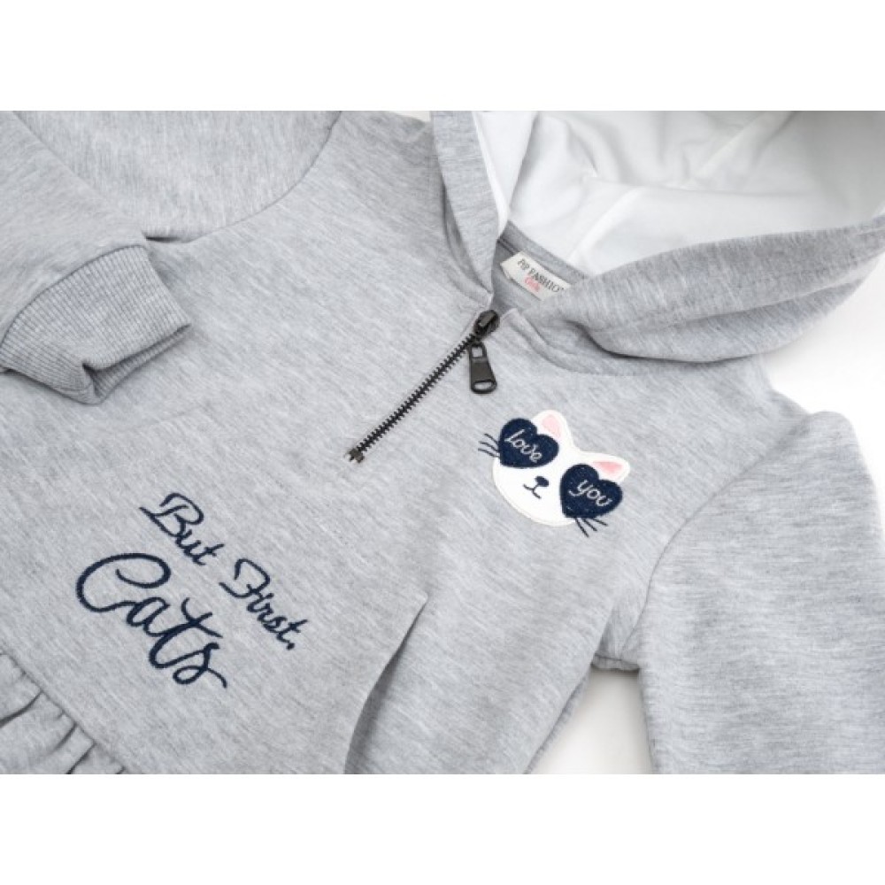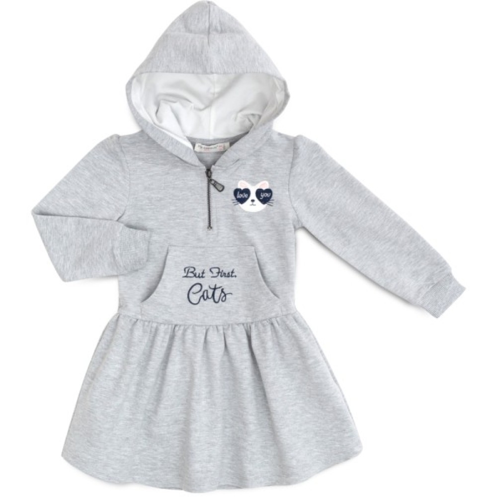 Цікава сукня, сірого меланжевого кольору, з довгими рукавами, з капюшоном, прикрашена аплікацією котика.