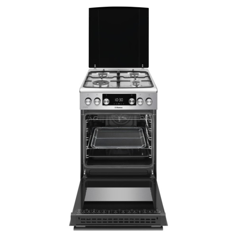 Hansa FCMX583292 – це стильна та функціональна комбінована плита з нержавіючої сталі. Газова варильна панель оснащена чавунними ґратами, турбоконфоркою та італійським газовим обладнанням для ефективного приготування. Простора 65-літрова електрична духовка пропонує 8 режимів, зокрема конвекцію, гриль і швидкий нагрів до 250°C. Каталітична система очищення спрощує догляд, а спеціальне деко AirFry дозволяє готувати без олії.