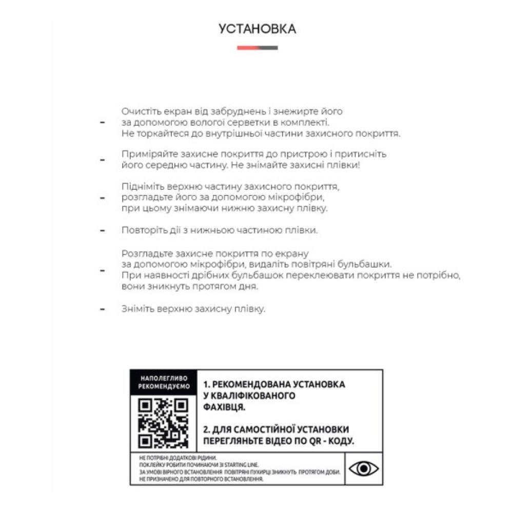 - Очистіть екран від забруднень і знежирте його за допомогою вологої серветки в комплекті. Намагайтеся не торкатися внутрішньої частини захисного покриття.