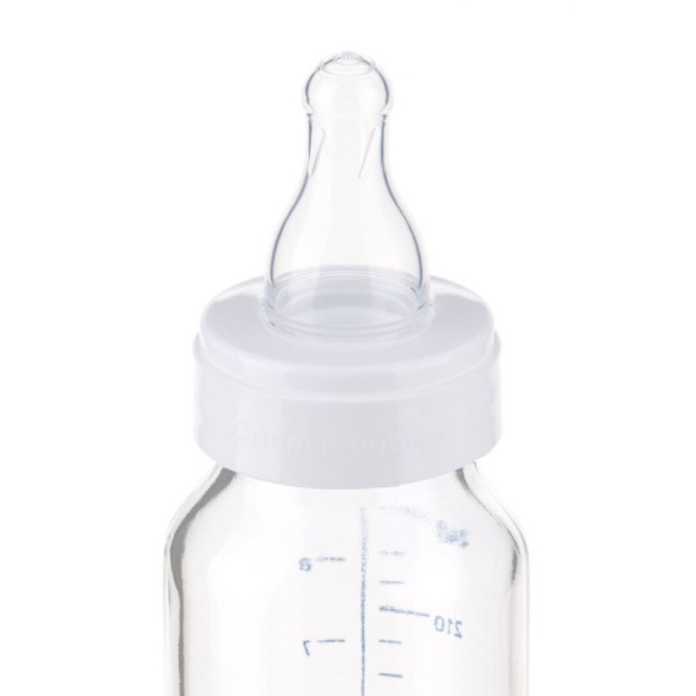 Довговічна, безпечна, міцна пляшечка з загартованого скла, з мірною шкалою. Відповідає найвищим стандартам якості. Пляшечку можна стерилізувати різними способами: в киплячій воді або в паровому стерилізаторі. У комплект входить кругла силіконова соска швидкого потоку. Від 12 місяців.