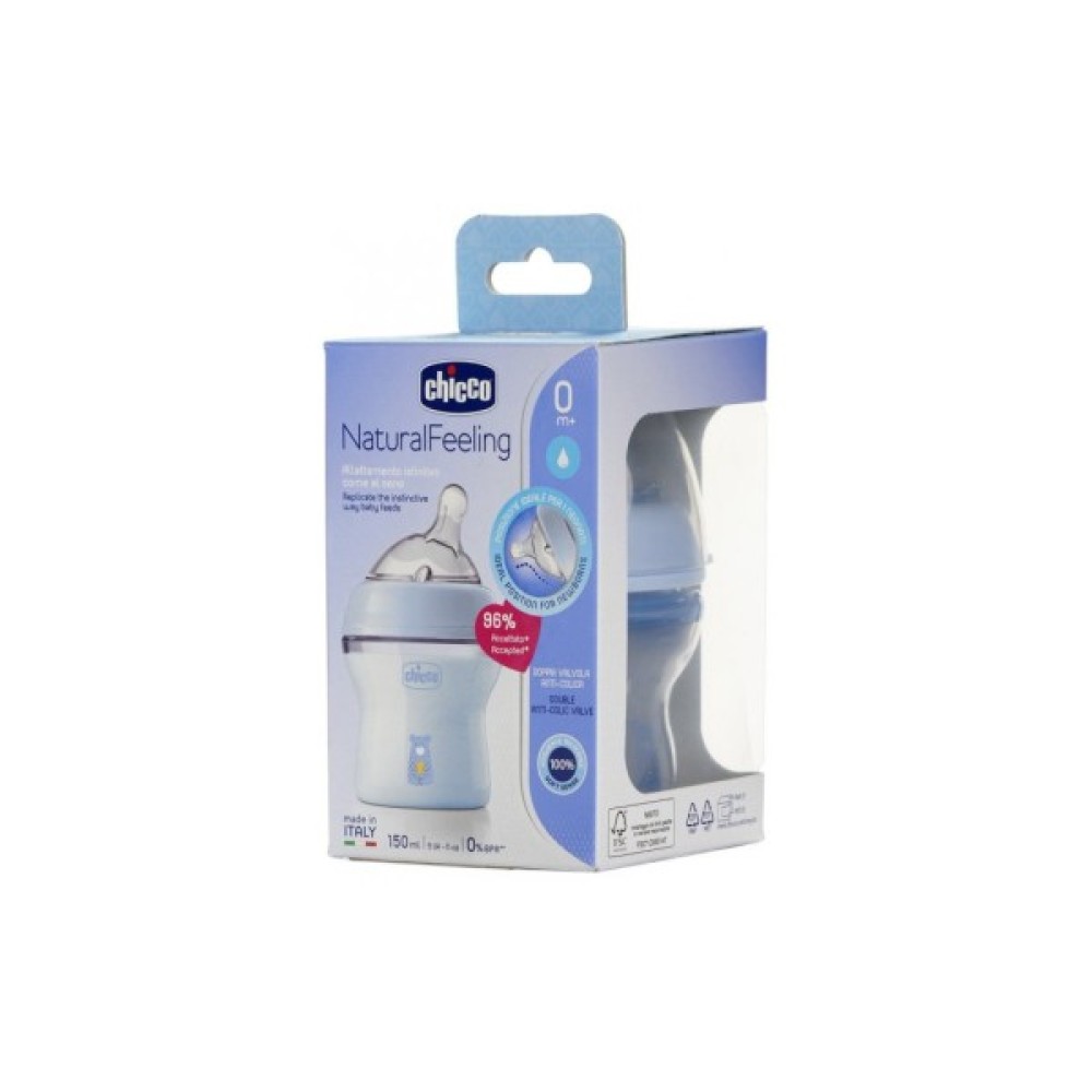 Пластикова пляшка Chicco Natural Feeling з похилою силіконовою соскою, яка завжди наповнена молоком, сприяє імітації природного вигодовування.