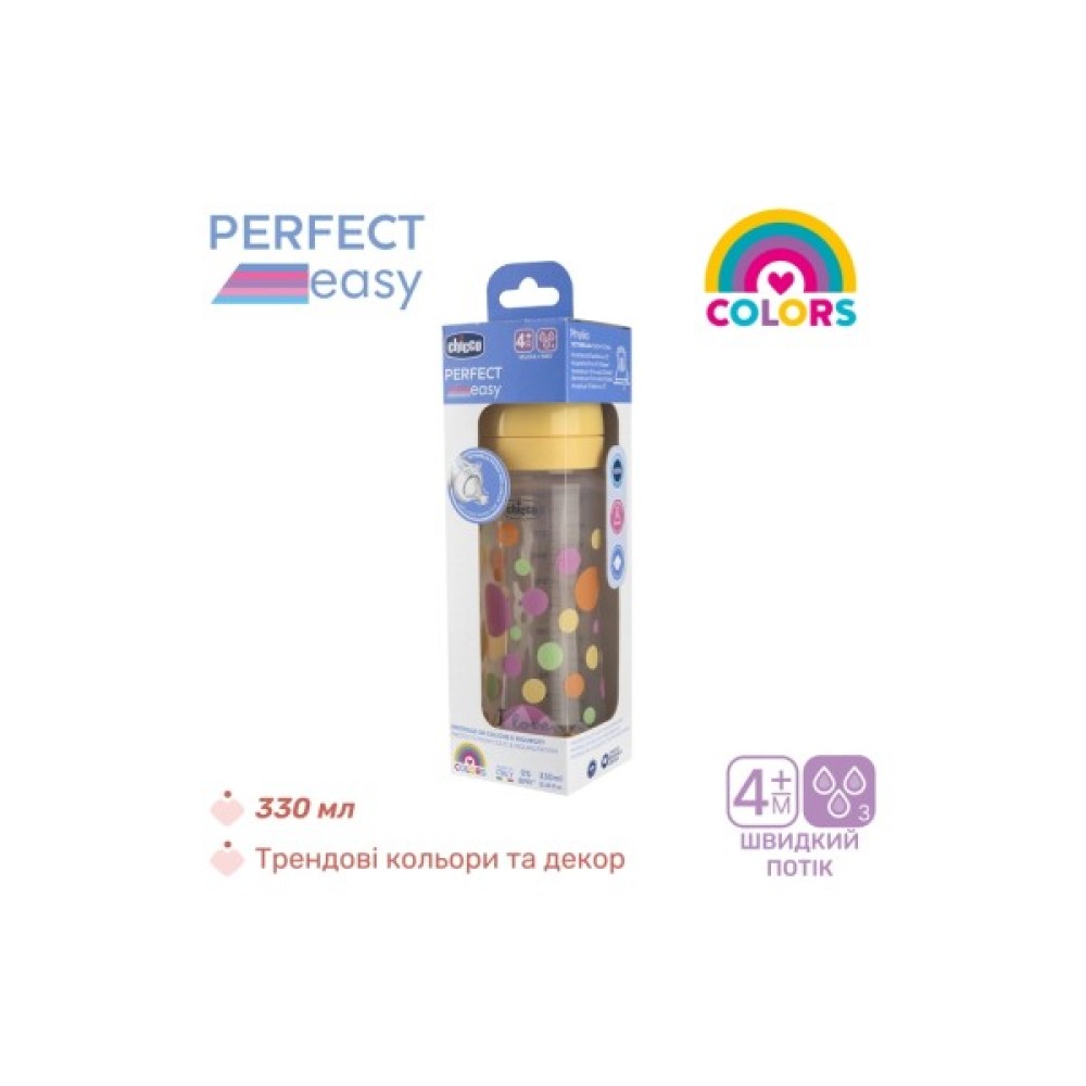 Пластикова пляшечка Chicco Perfect Easy з силіконовою соскою Physio забезпечує комфортне годування малюка як при змішаному, так і при штучному вигодовуванні.