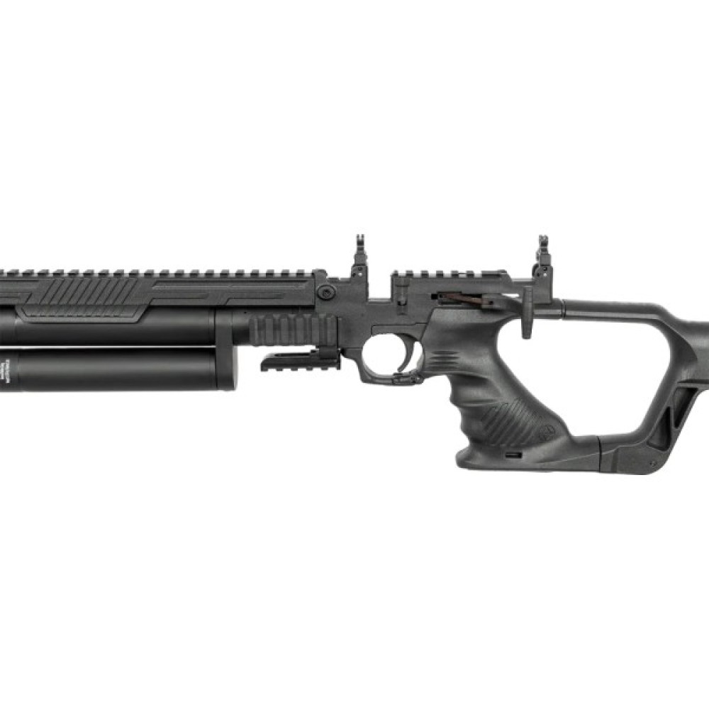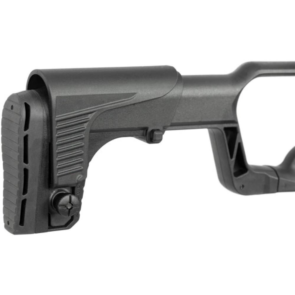 Телескопічний приклад оснащений гумовим потиличником і регульованою щокою, що дає змогу налаштувати його під індивідуальні особливості стрільця.