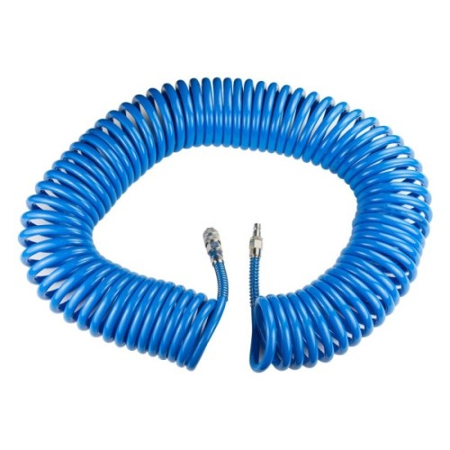 Шланг спіральний поліуретановий (PU) використовується для передачі повітря в пневматичних системах стандартного тиску. Має хорошу стійкість до механічних впливів (перегини, здавлювання, скручування) і швидко відновлює свою первинну форму після зняття механічного впливу. Шланг не схильний до гідролізу і має хорошу стійкість до впливу озону, масел, палива та мікроорганізмів.