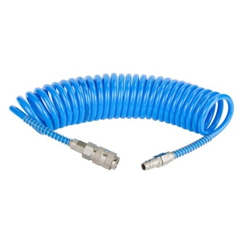 Шланг спіральний поліуретановий (PU) використовується для передачі повітря в пневматичних системах стандартного тиску. Має хорошу стійкість до механічних впливів (перегини, здавлювання, скручування) і швидко відновлює свою первинну форму після зняття механічного впливу. Шланг не схильний до гідролізу і має хорошу стійкість до впливу озону і мікроорганізмів.